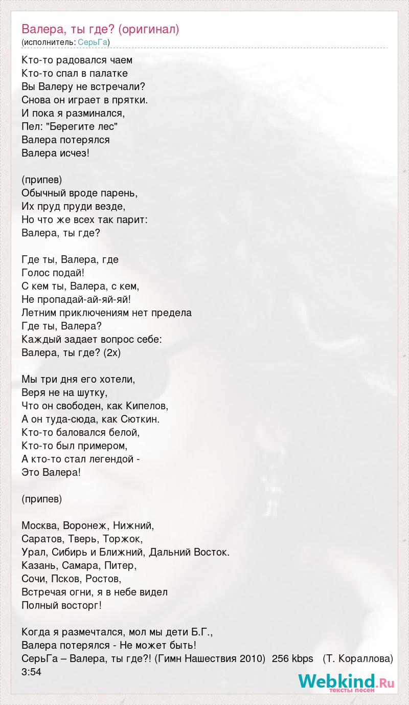 Кто-то радовался чаем Кто-то спал в палатке Вы Валеру не встречали? Снова он играет в прятки. И пока я разминался, Пел: "Берегите лес" Валера потерялся Валера исчез! (припев) Обычный вроде парень, Их пруд пруди везде, Но что же всех так парит: Валера, ты где? Где ты, Валера, где Голос подай! С кем ты, Валера, с кем, Не пропадай-ай-яй-яй! Летним приключениям нет предела Где ты, Валера? Каждый задает вопрос себе: Валера, ты где? (2х) Мы три дня его хотели, Веря не на шутку, Что он свободен, как Кипелов, А он туда-сюда, как Сюткин. Кто-то баловался белой, Кто-то был примером, А кто-то стал легендой - Это Валера! (припев) Москва, Воронеж, Нижний, Саратов, Тверь, Торжок, Урал, Сибирь и Ближний, Дальний Восток. Казань, Самара, Питер, Сочи, Псков, Ростов, Встречая огни, я в небе видел Полный восторг! Когда я размечтался, мол мы дети Б.Г., Валера потерялся - Не может быть! СерьГа – Валера, ты где?! (Гимн Нашествия 2010) 256 kbps (Т. Кораллова) 3:54