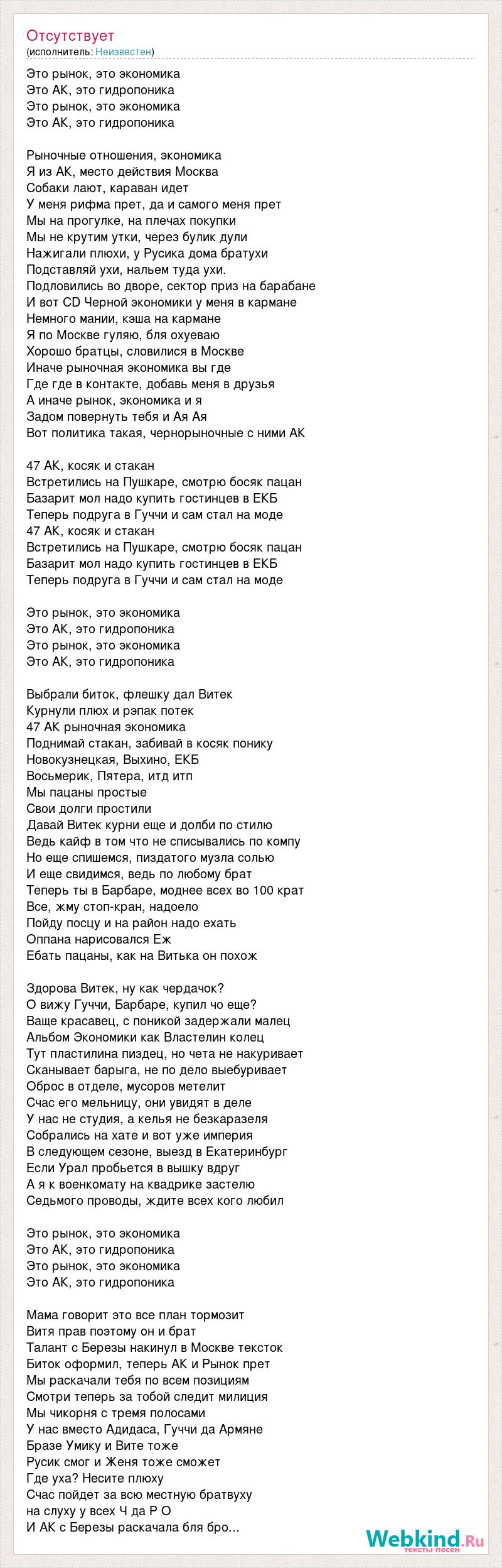 Это рынок, это экономика Это АК, это гидропоника Это рынок, это экономика Это АК, это гидропоника Рыночные отношения, экономика Я из АК, место действия Москва Собаки лают, караван идет У меня рифма прет, да и самого меня прет Мы на прогулке, на плечах покупки Мы не крутим утки, через булик дули Нажигали плюхи, у Русика дома братухи Подставляй ухи, нальем туда ухи. Подловились во дворе, сектор приз на барабане И вот CD Черной экономики у меня в кармане Немного мании, кэша на кармане Я по Москве гуляю, бля охуеваю Хорошо братцы, словилися в Москве Иначе рыночная экономика вы где Где где в контакте, добавь меня в друзья А иначе рынок, экономика и я Задом повернуть тебя и Ая Ая Вот политика такая, чернорыночные с ними АК 47 АК, косяк и стакан Встретились на Пушкаре, смотрю босяк пацан Базарит мол надо купить гостинцев в ЕКБ Теперь подруга в Гуччи и сам стал на моде 47 АК, косяк и стакан Встретились на Пушкаре, смотрю босяк пацан Базарит мол надо купить гостинцев в ЕКБ Теперь подруга в Гуччи и сам стал на моде Это рынок, это экономика Это АК, это гидропоника Это рынок, это экономика Это АК, это гидропоника Выбрали биток, флешку дал Витек Курнули плюх и рэпак потек 47 АК рыночная экономика Поднимай стакан, забивай в косяк понику Новокузнецкая, Выхино, ЕКБ Восьмерик, Пятера, итд итп Мы пацаны простые Свои долги простили Давай Витек курни еще и долби по стилю Ведь кайф в том что не списывались по компу Но еще спишемся, пиздатого музла солью И еще свидимся, ведь по любому брат Теперь ты в Барбаре, моднее всех во 100 крат Все, жму стоп-кран, надоело Пойду посцу и на район надо ехать Оппана нарисовался Еж Ебать пацаны, как на Витька он похож Здорова Витек, ну как чердачок? О вижу Гуччи, Барбаре, купил чо еще? Ваще красавец, с поникой задержали малец Альбом Экономики как Властелин колец Тут пластилина пиздец, но чета не накуривает Сканывает барыга, не по дело выебуривает Оброс в отделе, мусоров метелит Счас его мельницу, они увидят в деле У нас не студия, а келья не безкаразеля Собрались на хате и вот уже империя В следующем сезоне, выезд в Екатеринбург Если Урал пробьется в вышку вдруг А я к военкомату на квадрике застелю Седьмого проводы, ждите всех кого любил Это рынок, это экономика Это АК, это гидропоника Это рынок, это экономика Это АК, это гидропоника Мама говорит это все план тормозит Витя прав поэтому он и брат Талант с Березы накинул в Москве тексток Биток оформил, теперь АК и Рынок прет Мы раскачали тебя по всем позициям Смотри теперь за тобой следит милиция Мы чикорня с тремя полосами У нас вместо Адидаса, Гуччи да Армяне Бразе Умику и Вите тоже Русик смог и Женя тоже сможет Где уха? Несите плюху Счас пойдет за всю местную братвуху на слуху у всех Ч да Р О И АК с Березы раскачала бля бро...
