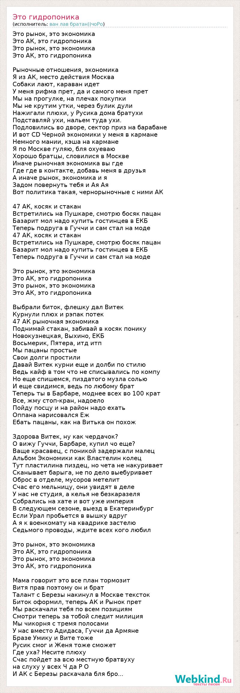 Это рынок, это экономика Это АК, это гидропоника Это рынок, это экономика Это АК, это гидропоника Рыночные отношения, экономика Я из АК, место действия Москва Собаки лают, караван идет У меня рифма прет, да и самого меня прет Мы на прогулке, на плечах покупки Мы не крутим утки, через булик дули Нажигали плюхи, у Русика дома братухи Подставляй ухи, нальем туда ухи. Подловились во дворе, сектор приз на барабане И вот CD Черной экономики у меня в кармане Немного мании, кэша на кармане Я по Москве гуляю, бля охуеваю Хорошо братцы, словилися в Москве Иначе рыночная экономика вы где Где где в контакте, добавь меня в друзья А иначе рынок, экономика и я Задом повернуть тебя и Ая Ая Вот политика такая, чернорыночные с ними АК 47 АК, косяк и стакан Встретились на Пушкаре, смотрю босяк пацан Базарит мол надо купить гостинцев в ЕКБ Теперь подруга в Гуччи и сам стал на моде 47 АК, косяк и стакан Встретились на Пушкаре, смотрю босяк пацан Базарит мол надо купить гостинцев в ЕКБ Теперь подруга в Гуччи и сам стал на моде Это рынок, это экономика Это АК, это гидропоника Это рынок, это экономика Это АК, это гидропоника Выбрали биток, флешку дал Витек Курнули плюх и рэпак потек 47 АК рыночная экономика Поднимай стакан, забивай в косяк понику Новокузнецкая, Выхино, ЕКБ Восьмерик, Пятера, итд итп Мы пацаны простые Свои долги простили Давай Витек курни еще и долби по стилю Ведь кайф в том что не списывались по компу Но еще спишемся, пиздатого музла солью И еще свидимся, ведь по любому брат Теперь ты в Барбаре, моднее всех во 100 крат Все, жму стоп-кран, надоело Пойду посцу и на район надо ехать Оппана нарисовался Еж Ебать пацаны, как на Витька он похож Здорова Витек, ну как чердачок? О вижу Гуччи, Барбаре, купил чо еще? Ваще красавец, с поникой задержали малец Альбом Экономики как Властелин колец Тут пластилина пиздец, но чета не накуривает Сканывает барыга, не по дело выебуривает Оброс в отделе, мусоров метелит Счас его мельницу, они увидят в деле У нас не студия, а келья не безкаразеля Собрались на хате и вот уже империя В следующем сезоне, выезд в Екатеринбург Если Урал пробьется в вышку вдруг А я к военкомату на квадрике застелю Седьмого проводы, ждите всех кого любил Это рынок, это экономика Это АК, это гидропоника Это рынок, это экономика Это АК, это гидропоника Мама говорит это все план тормозит Витя прав поэтому он и брат Талант с Березы накинул в Москве тексток Биток оформил, теперь АК и Рынок прет Мы раскачали тебя по всем позициям Смотри теперь за тобой следит милиция Мы чикорня с тремя полосами У нас вместо Адидаса, Гуччи да Армяне Бразе Умику и Вите тоже Русик смог и Женя тоже сможет Где уха? Несите плюху Счас пойдет за всю местную братвуху на слуху у всех Ч да Р О И АК с Березы раскачала бля бро...