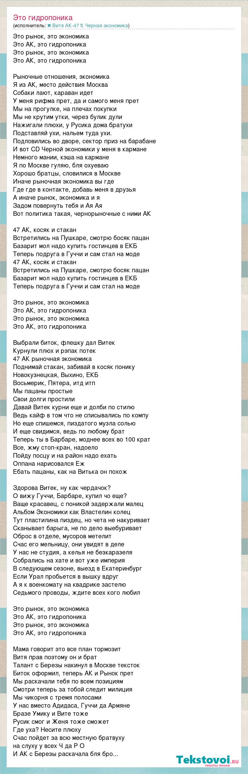 Это рынок, это экономика Это АК, это гидропоника Это рынок, это экономика Это АК, это гидропоника Рыночные отношения, экономика Я из АК, место действия Москва Собаки лают, караван идет У меня рифма прет, да и самого меня прет Мы на прогулке, на плечах покупки Мы не крутим утки, через булик дули Нажигали плюхи, у Русика дома братухи Подставляй ухи, нальем туда ухи. Подловились во дворе, сектор приз на барабане И вот CD Черной экономики у меня в кармане Немного мании, кэша на кармане Я по Москве гуляю, бля охуеваю Хорошо братцы, словилися в Москве Иначе рыночная экономика вы где Где где в контакте, добавь меня в друзья А иначе рынок, экономика и я Задом повернуть тебя и Ая Ая Вот политика такая, чернорыночные с ними АК 47 АК, косяк и стакан Встретились на Пушкаре, смотрю босяк пацан Базарит мол надо купить гостинцев в ЕКБ Теперь подруга в Гуччи и сам стал на моде 47 АК, косяк и стакан Встретились на Пушкаре, смотрю босяк пацан Базарит мол надо купить гостинцев в ЕКБ Теперь подруга в Гуччи и сам стал на моде Это рынок, это экономика Это АК, это гидропоника Это рынок, это экономика Это АК, это гидропоника Выбрали биток, флешку дал Витек Курнули плюх и рэпак потек 47 АК рыночная экономика Поднимай стакан, забивай в косяк понику Новокузнецкая, Выхино, ЕКБ Восьмерик, Пятера, итд итп Мы пацаны простые Свои долги простили Давай Витек курни еще и долби по стилю Ведь кайф в том что не списывались по компу Но еще спишемся, пиздатого музла солью И еще свидимся, ведь по любому брат Теперь ты в Барбаре, моднее всех во 100 крат Все, жму стоп-кран, надоело Пойду посцу и на район надо ехать Оппана нарисовался Еж Ебать пацаны, как на Витька он похож Здорова Витек, ну как чердачок? О вижу Гуччи, Барбаре, купил чо еще? Ваще красавец, с поникой задержали малец Альбом Экономики как Властелин колец Тут пластилина пиздец, но чета не накуривает Сканывает барыга, не по дело выебуривает Оброс в отделе, мусоров метелит Счас его мельницу, они увидят в деле У нас не студия, а келья не безкаразеля Собрались на хате и вот уже империя В следующем сезоне, выезд в Екатеринбург Если Урал пробьется в вышку вдруг А я к военкомату на квадрике застелю Седьмого проводы, ждите всех кого любил Это рынок, это экономика Это АК, это гидропоника Это рынок, это экономика Это АК, это гидропоника Мама говорит это все план тормозит Витя прав поэтому он и брат Талант с Березы накинул в Москве тексток Биток оформил, теперь АК и Рынок прет Мы раскачали тебя по всем позициям Смотри теперь за тобой следит милиция Мы чикорня с тремя полосами У нас вместо Адидаса, Гуччи да Армяне Бразе Умику и Вите тоже Русик смог и Женя тоже сможет Где уха? Несите плюху Счас пойдет за всю местную братвуху на слуху у всех Ч да Р О И АК с Березы раскачала бля бро...