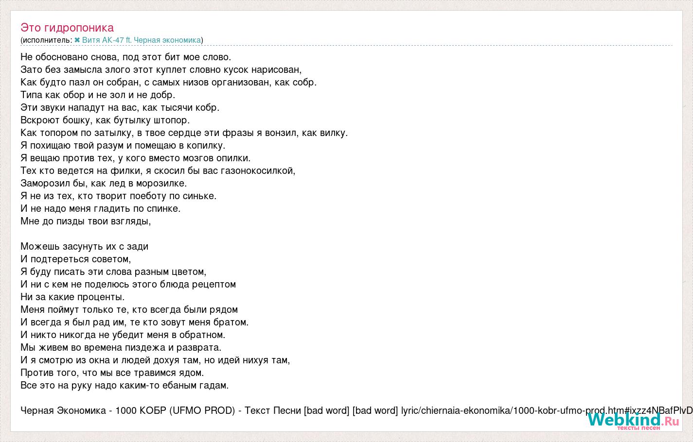 Не обосновано снова, под этот бит мое слово. Зато без замысла злого этот куплет словно кусок нарисован, Как будто пазл он собран, с самых низов организован, как собр. Типа как обор и не зол и не добр. Эти звуки нападут на вас, как тысячи кобр. Вскроют бошку, как бутылку штопор. Как топором по затылку, в твое сердце эти фразы я вонзил, как вилку. Я похищаю твой разум и помещаю в копилку. Я вещаю против тех, у кого вместо мозгов опилки. Тех кто ведется на филки, я скосил бы вас газонокосилкой, Заморозил бы, как лед в морозилке. Я не из тех, кто творит поеботу по синьке. И не надо меня гладить по спинке. Мне до пизды твои взгляды, Можешь засунуть их с зади И подтереться советом, Я буду писать эти слова разным цветом, И ни с кем не поделюсь этого блюда рецептом Ни за какие проценты. Меня поймут только те, кто всегда были рядом И всегда я был рад им, те кто зовут меня братом. И никто никогда не убедит меня в обратном. Мы живем во времена пиздежа и разврата. И я смотрю из окна и людей дохуя там, но идей нихуя там, Против того, что мы все травимся ядом. Все это на руку надо каким-то ебаным гадам. Черная Экономика - 1000 КОБР (UFMO PROD) - Текст Песни [bad word] [bad word] lyric/chiernaia-ekonomika/1000-kobr-ufmo-prod.htm#ixzz4NBafPlvD