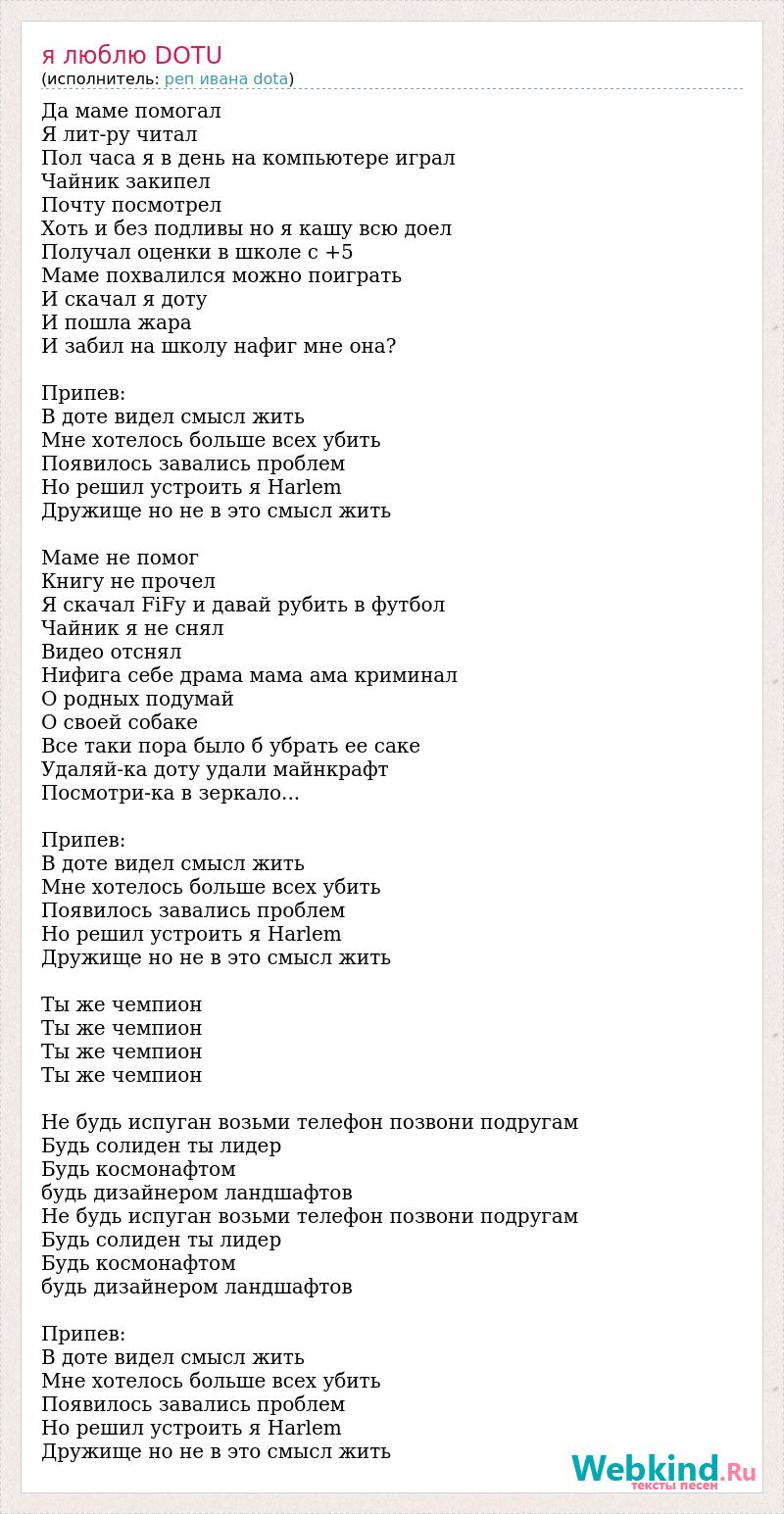 Да маме помогал Я лит-ру читал Пол часа я в день на компьютере играл Чайник закипел Почту посмотрел Хоть и без подливы но я кашу всю доел Получал оценки в школе с +5 Маме похвалился можно поиграть И скачал я доту И пошла жара И забил на школу нафиг мне она? Припев: В доте видел смысл жить Мне хотелось больше всех убить Появилось завались проблем Но решил устроить я Harlem Дружище но не в это смысл жить Маме не помог Книгу не прочел Я скачал FiFу и давай рубить в футбол Чайник я не снял Видео отснял Нифига себе драма мама ама криминал О родных подумай О своей собаке Все таки пора было б убрать ее саке Удаляй-ка доту удали майнкрафт Посмотри-ка в зеркало... Припев: В доте видел смысл жить Мне хотелось больше всех убить Появилось завались проблем Но решил устроить я Harlem Дружище но не в это смысл жить Ты же чемпион Ты же чемпион Ты же чемпион Ты же чемпион Не будь испуган возьми телефон позвони подругам Будь солиден ты лидер Будь космонафтом будь дизайнером ландшафтов Не будь испуган возьми телефон позвони подругам Будь солиден ты лидер Будь космонафтом будь дизайнером ландшафтов Припев: В доте видел смысл жить Мне хотелось больше всех убить Появилось завались проблем Но решил устроить я Harlem Дружище но не в это смысл жить
