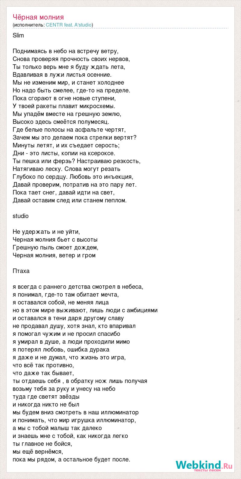 Slim Поднимаясь в небо на встречу ветру, Снова проверяя прочность своих нервов, Ты только верь мне я буду ждать лета, Вдавливая в лужи листья осенние. Мы не изменим мир, и станет холоднее Но надо быть смелее, где-то на пределе. Пока сгорают в огне новые ступени, У твоей ракеты плавит микросхемы. Мы упадём вместе на грешную землю, Высоко здесь смеётся полумесяц. Где белые полосы на асфальте чертят, Зачем мы это делаем пока стрелки вертят? Минуты летят, и их съедает серость; Дни - это листы, копии на ксероксе. Ты пешка или ферзь? Настраиваю резкость, Натягиваю леску. Слова могут резать Глубоко по сердцу. Любовь это инъекция, Давай проверим, потратив на это пару лет. Пока тает снег, давай идти на свет, Давай оставим след или станем пеплом. studio Не удержать и не уйти, Черная молния бьет с высоты Грешную пыль смоет дождем, Черная молния, ветер и гром Птаха я всегда с раннего детства смотрел в небеса, я понимал, где-то там обитает мечта, я оставался собой, не меняя лица но в этом мире выживают, лишь люди с амбициями и оставался в тени даря другому славу не продавал душу, хотя знал, кто впаривал я помогал чужим и не просил спасибо я умирал в душе, а люди проходили мимо я потерял любовь, ошибка дурака я даже и не думал, что жизнь это игра, что всё так противно, что даже так бывает, ты отдаешь себя , в обратку нож лишь получая возьму тебя за руку и унесу на небо туда где светят звёзды и никогда никто не был мы будем вниз смотреть в наш иллюминатор и понимать, что мир игрушка иллюминатор, а мы с тобой малыш так далеко и знаешь мне с тобой, как никогда легко ты главное не бойся, мы ещё вернёмся, пока мы рядом, а остальное будет после.