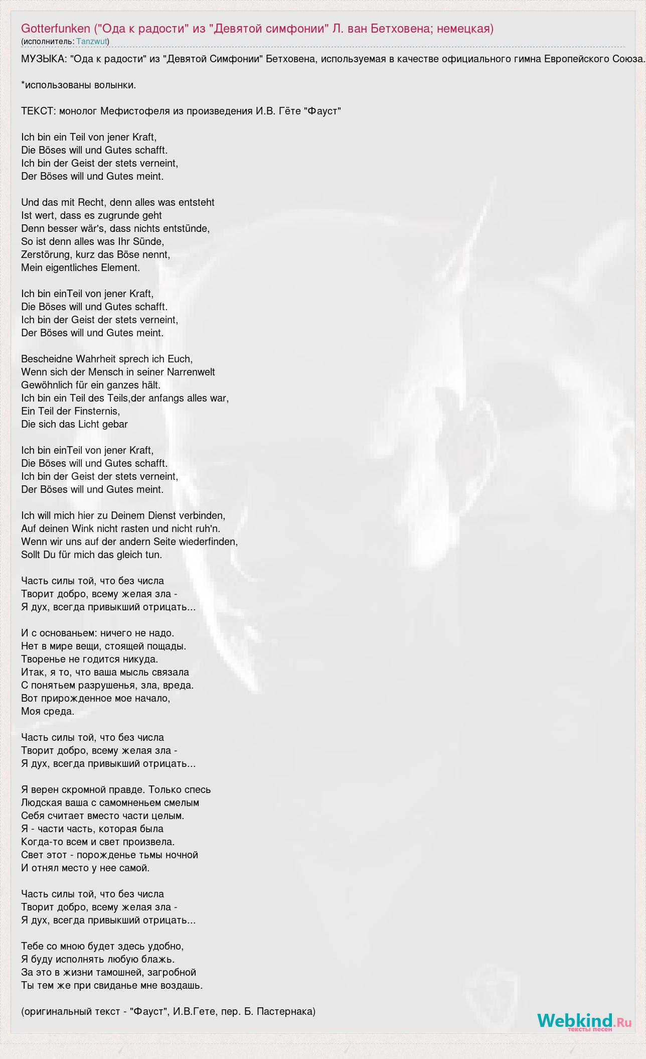 Главная→Исполнители→Tanzwut→Gotterfunken ("Ода к радости" из "Девятой симфонии" Л. ван Бетховена; немецкая)