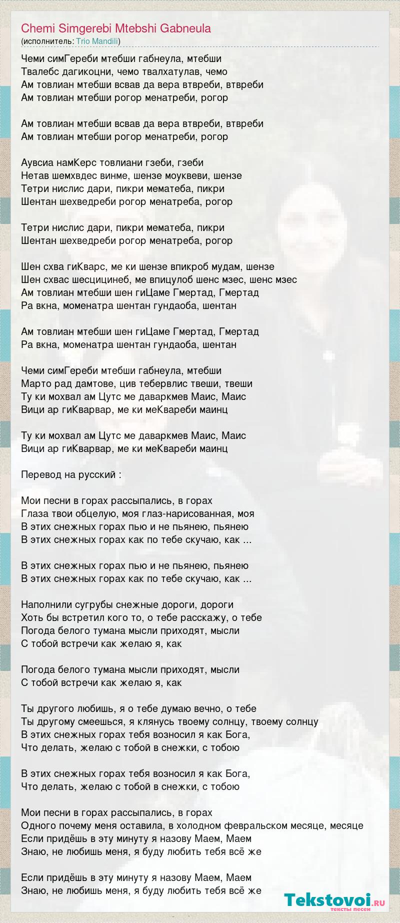Чеми симГереби мтебши габнеула, мтебши Твалебс дагикоцни, чемо твалхатулав, чемо Ам товлиан мтебши всвав да вера втвреби, втвреби Ам товлиан мтебши рогор менатреби, рогор Ам товлиан мтебши всвав да вера втвреби, втвреби Ам товлиан мтебши рогор менатреби, рогор Аувсиа намКерс товлиани гзеби, гзеби Нетав шемхвдес винме, шензе моуквеви, шензе Тетри нислис дари, пикри мематеба, пикри Шентан шехведреби рогор менатреба, рогор Тетри нислис дари, пикри мематеба, пикри Шентан шехведреби рогор менатреба, рогор Шен схва гиКварс, ме ки шензе впикроб мудам, шензе Шен схвас шесцицинеб, ме впицулоб шенс мзес, шенс мзес Ам товлиан мтебши шен гиЦаме Гмертад, Гмертад Ра вкна, моменатра шентан гундаоба, шентан Ам товлиан мтебши шен гиЦаме Гмертад, Гмертад Ра вкна, моменатра шентан гундаоба, шентан Чеми симГереби мтебши габнеула, мтебши Марто рад дамтове, цив тебервлис твеши, твеши Ту ки мохвал ам Цутс ме даваркмев Маис, Маис Вици ар гиКварвар, ме ки меКвареби маинц Ту ки мохвал ам Цутс ме даваркмев Маис, Маис Вици ар гиКварвар, ме ки меКвареби маинц Перевод на русский : Мои песни в горах рассыпались, в горах Глаза твои обцелую, моя глаз-нарисованная, моя В этих снежных горах пью и не пьянею, пьянею В этих снежных горах как по тебе скучаю, как ... В этих снежных горах пью и не пьянею, пьянею В этих снежных горах как по тебе скучаю, как ... Наполнили сугрубы снежные дороги, дороги Хоть бы встретил кого то, о тебе расскажу, о тебе Погода белого тумана мысли приходят, мысли С тобой встречи как желаю я, как Погода белого тумана мысли приходят, мысли С тобой встречи как желаю я, как Ты другого любишь, я о тебе думаю вечно, о тебе Ты другому смеешься, я клянусь твоему солнцу, твоему солнцу В этих снежных горах тебя возносил я как Бога, Что делать, желаю с тобой в снежки, с тобою В этих снежных горах тебя возносил я как Бога, Что делать, желаю с тобой в снежки, с тобою Мои песни в горах рассыпались, в горах Одного почему меня оставила, в холодном февральском месяце, месяце Если придёшь в эту минуту я назову Маем, Маем Знаю, не любишь меня, я буду любить тебя всё же Если придёшь в эту минуту я назову Маем, Маем Знаю, не любишь меня, я буду любить тебя всё же