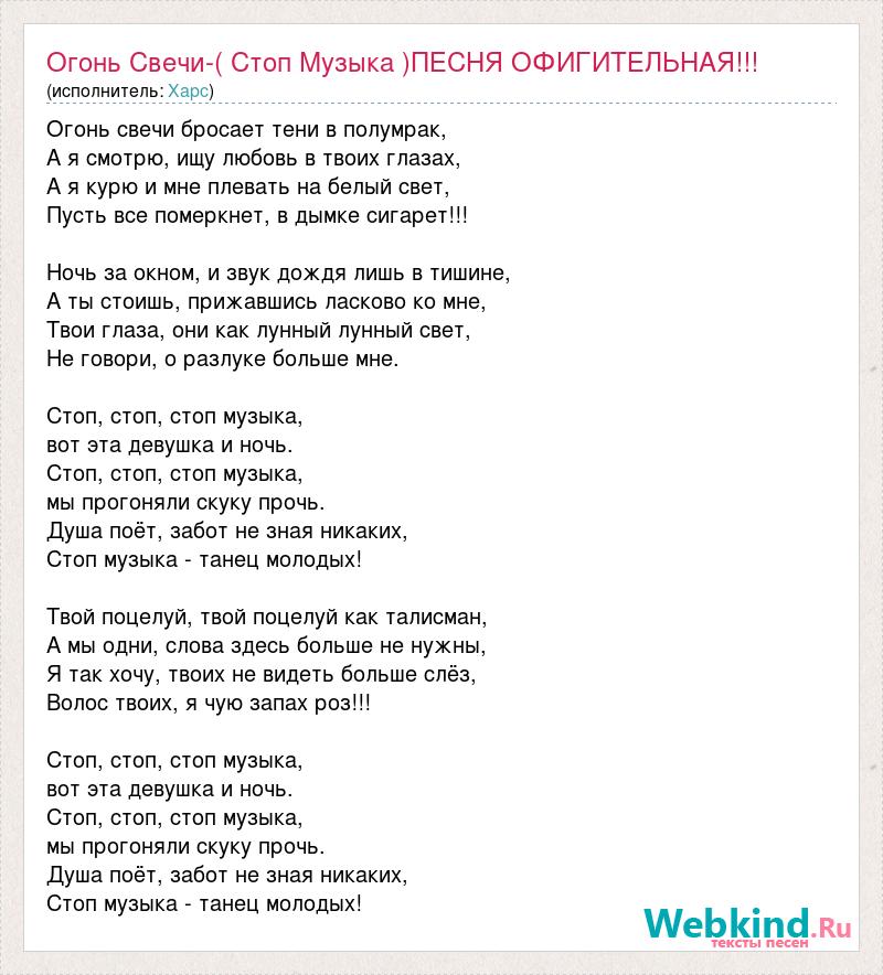 Огонь свечи бросает тени в полумрак, А я смотрю, ищу любовь в твоих глазах, А я курю и мне плевать на белый свет, Пусть все померкнет, в дымке сигарет!!! Ночь за окном, и звук дождя лишь в тишине, А ты стоишь, прижавшись ласково ко мне, Твои глаза, они как лунный лунный свет, Не говори, о разлуке больше мне. Стоп, стоп, стоп музыка, вот эта девушка и ночь. Стоп, стоп, стоп музыка, мы прогоняли скуку прочь. Душа поёт, забот не зная никаких, Стоп музыка - танец молодых! Твой поцелуй, твой поцелуй как талисман, А мы одни, слова здесь больше не нужны, Я так хочу, твоих не видеть больше слёз, Волос твоих, я чую запах роз!!! Стоп, стоп, стоп музыка, вот эта девушка и ночь. Стоп, стоп, стоп музыка, мы прогоняли скуку прочь. Душа поёт, забот не зная никаких, Стоп музыка - танец молодых!