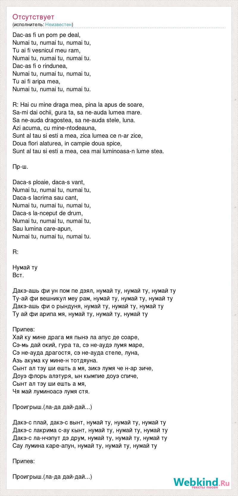Dac-as fi un pom pe deal, Numai tu, numai tu, numai tu, Tu ai fi vesnicul meu ram, Numai tu, numai tu, numai tu. Dac-as fi o rindunea, Numai tu, numai tu, numai tu, Tu ai fi aripa mea, Numai tu, numai tu, numai tu. R: Hai cu mine draga mea, pina la apus de soare, Sa-mi dai ochii, gura ta, sa ne-auda lumea mare. Sa ne-auda dragostea, sa ne-auda stele, luna. Azi acuma, cu mine-ntodeauna, Sunt al tau si esti a mea, zica lumea ce n-ar zice, Doua flori alaturea, in campie doua spice, Sunt al tau si esti a mea, cea mai luminoasa-n lume stea. Пр-ш. Daca-s ploaie, daca-s vant, Numai tu, numai tu, numai tu, Daca-s lacrima sau cant, Numai tu, numai tu, numai tu, Daca-s la-nceput de drum, Numai tu, numai tu, numai tu, Sau lumina care-apun, Numai tu, numai tu, numai tu. R: Нумай ту Вст. Дакэ-ашь фи ун пом пе дэял, нумай ту, нумай ту, нумай ту Ту-ай фи вешникул меу рам, нумай ту, нумай ту, нумай ту Дакэ-ашь фи о рындуня, нумай ту, нумай ту, нумай ту Ту ай фи арипа мя, нумай ту, нумай ту, нумай ту Припев: Хай ку мине драга мя пынэ ла апус де соаре, Сэ-мь дай окий, гура та, сэ не-аудэ лумя маре, Сэ не-ауда драгостя, сэ не-ауда стеле, луна, Азь акума ку мине-н тотдяуна. Сынт ал тэу ши ешть а мя, зикэ лумя че н-ар зиче, Доуэ флорь алэтуря, ын кымпие доуэ спиче, Сынт ал тэу ши ешть а мя, Чя май луминоасэ лумя стя. Проигрыш.(ла-да дай-дай...) Дакэ-с плай, дакэ-с вынт, нумай ту, нумай ту, нумай ту Дакэ-с лакрима с-ау кынт, нумай ту, нумай ту, нумай ту Дакэ-с ла-нчэпут дэ друм, нумай ту, нумай ту, нумай ту Сау лумина каре-апун, нумай ту, нумай ту, нумай ту Припев: Проигрыш.(ла-да дай-дай...)