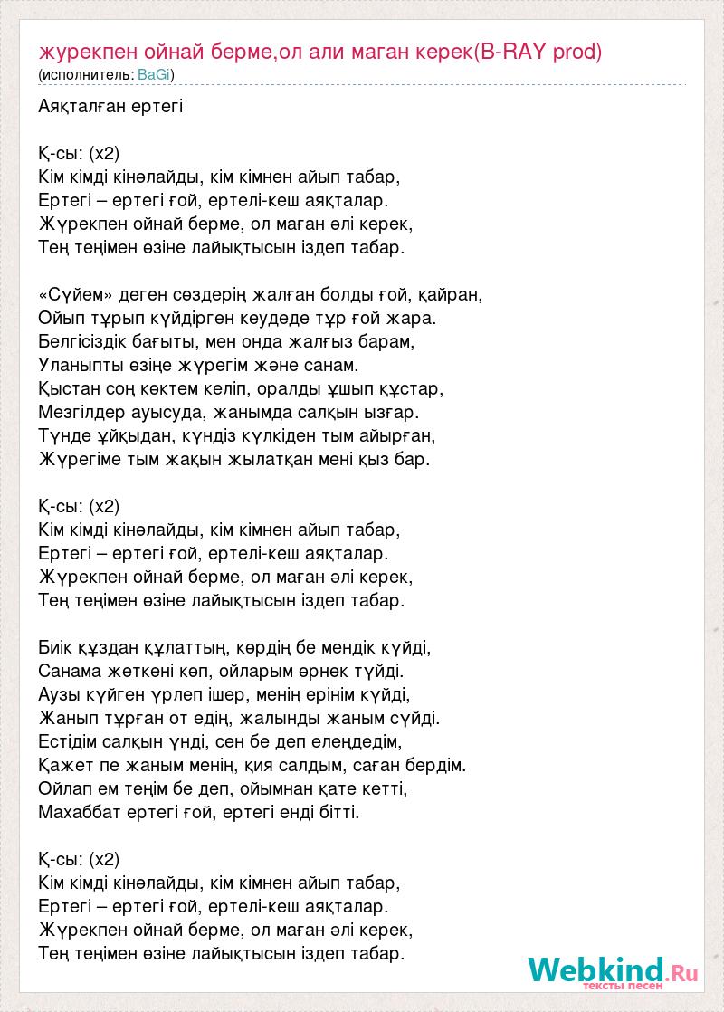 Аяқталған ертегі Қ-сы: (х2) Кім кімді кінәлайды, кім кімнен айып табар, Ертегі – ертегі ғой, ертелі-кеш аяқталар. Жүрекпен ойнай берме, ол маған әлі керек, Тең теңімен өзіне лайықтысын іздеп табар. «Сүйем» деген сөздерің жалған болды ғой, қайран, Ойып тұрып күйдірген кеудеде тұр ғой жара. Белгісіздік бағыты, мен онда жалғыз барам, Уланыпты өзіңе жүрегім және санам. Қыстан соң көктем келіп, оралды ұшып құстар, Мезгілдер ауысуда, жанымда салқын ызғар. Түнде ұйқыдан, күндіз күлкіден тым айырған, Жүрегіме тым жақын жылатқан мені қыз бар. Қ-сы: (х2) Кім кімді кінәлайды, кім кімнен айып табар, Ертегі – ертегі ғой, ертелі-кеш аяқталар. Жүрекпен ойнай берме, ол маған әлі керек, Тең теңімен өзіне лайықтысын іздеп табар. Биік құздан құлаттың, көрдің бе мендік күйді, Санама жеткені көп, ойларым өрнек түйді. Аузы күйген үрлеп ішер, менің ерінім күйді, Жанып тұрған от едің, жалынды жаным сүйді. Естідім салқын үнді, сен бе деп елеңдедім, Қажет пе жаным менің, қия салдым, саған бердім. Ойлап ем теңім бе деп, ойымнан қате кетті, Махаббат ертегі ғой, ертегі енді бітті. Қ-сы: (х2) Кім кімді кінәлайды, кім кімнен айып табар, Ертегі – ертегі ғой, ертелі-кеш аяқталар. Жүрекпен ойнай берме, ол маған әлі керек, Тең теңімен өзіне лайықтысын іздеп табар.