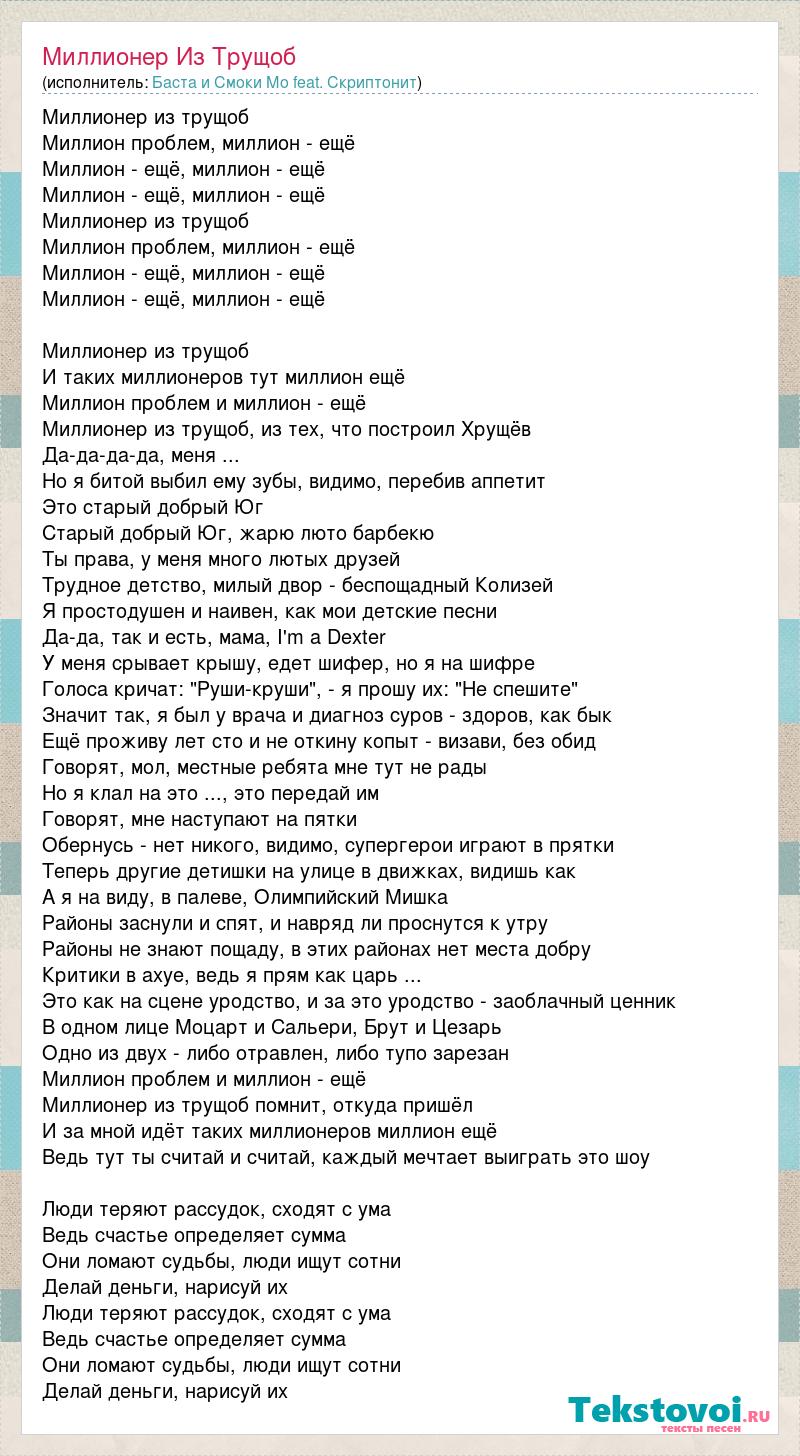 Миллионер из трущоб Миллион проблем, миллион - ещё Миллион - ещё, миллион - ещё Миллион - ещё, миллион - ещё Миллионер из трущоб Миллион проблем, миллион - ещё Миллион - ещё, миллион - ещё Миллион - ещё, миллион - ещё Миллионер из трущоб И таких миллионеров тут миллион ещё Миллион проблем и миллион - ещё Миллионер из трущоб, из тех, что построил Хрущёв Да-да-да-да, меня ... Но я битой выбил ему зубы, видимо, перебив аппетит Это старый добрый Юг Старый добрый Юг, жарю люто барбекю Ты права, у меня много лютых друзей Трудное детство, милый двор - беспощадный Колизей Я простодушен и наивен, как мои детские песни Да-да, так и есть, мама, I'm a Dexter У меня срывает крышу, едет шифер, но я на шифре Голоса кричат: "Руши-круши", - я прошу их: "Не спешите" Значит так, я был у врача и диагноз суров - здоров, как бык Ещё проживу лет сто и не откину копыт - визави, без обид Говорят, мол, местные ребята мне тут не рады Но я клал на это ..., это передай им Говорят, мне наступают на пятки Обернусь - нет никого, видимо, супергерои играют в прятки Теперь другие детишки на улице в движках, видишь как А я на виду, в палеве, Олимпийский Мишка Районы заснули и спят, и навряд ли проснутся к утру Районы не знают пощаду, в этих районах нет места добру Критики в ахуе, ведь я прям как царь ... Это как на сцене уродство, и за это уродство - заоблачный ценник В одном лице Моцарт и Сальери, Брут и Цезарь Одно из двух - либо отравлен, либо тупо зарезан Миллион проблем и миллион - ещё Миллионер из трущоб помнит, откуда пришёл И за мной идёт таких миллионеров миллион ещё Ведь тут ты считай и считай, каждый мечтает выиграть это шоу Люди теряют рассудок, сходят с ума Ведь счастье определяет сумма Они ломают судьбы, люди ищут сотни Делай деньги, нарисуй их Люди теряют рассудок, сходят с ума Ведь счастье определяет сумма Они ломают судьбы, люди ищут сотни Делай деньги, нарисуй их