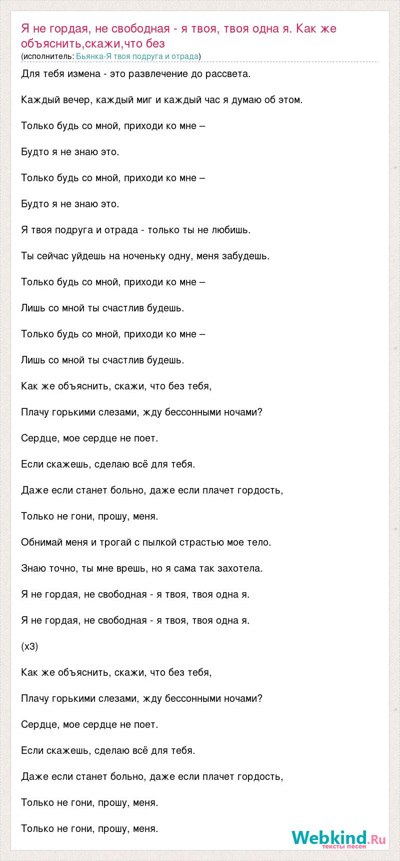 Для тебя измена - это развлечение до рассвета. Каждый вечер, каждый миг и каждый час я думаю об этом. Только будь со мной, приходи ко мне – Будто я не знаю это. Только будь со мной, приходи ко мне – Будто я не знаю это. Я твоя подруга и отрада - только ты не любишь. Ты сейчас уйдешь на ноченьку одну, меня забудешь. Только будь со мной, приходи ко мне – Лишь со мной ты счастлив будешь. Только будь со мной, приходи ко мне – Лишь со мной ты счастлив будешь. Как же объяснить, скажи, что без тебя, Плачу горькими слезами, жду бессонными ночами? Сердце, мое сердце не поет. Если скажешь, сделаю всё для тебя. Даже если станет больно, даже если плачет гордость, Только не гони, прошу, меня. Обнимай меня и трогай с пылкой страстью мое тело. Знаю точно, ты мне врешь, но я сама так захотела. Я не гордая, не свободная - я твоя, твоя одна я. Я не гордая, не свободная - я твоя, твоя одна я. (х3) Как же объяснить, скажи, что без тебя, Плачу горькими слезами, жду бессонными ночами? Сердце, мое сердце не поет. Если скажешь, сделаю всё для тебя. Даже если станет больно, даже если плачет гордость, Только не гони, прошу, меня. Только не гони, прошу, меня.