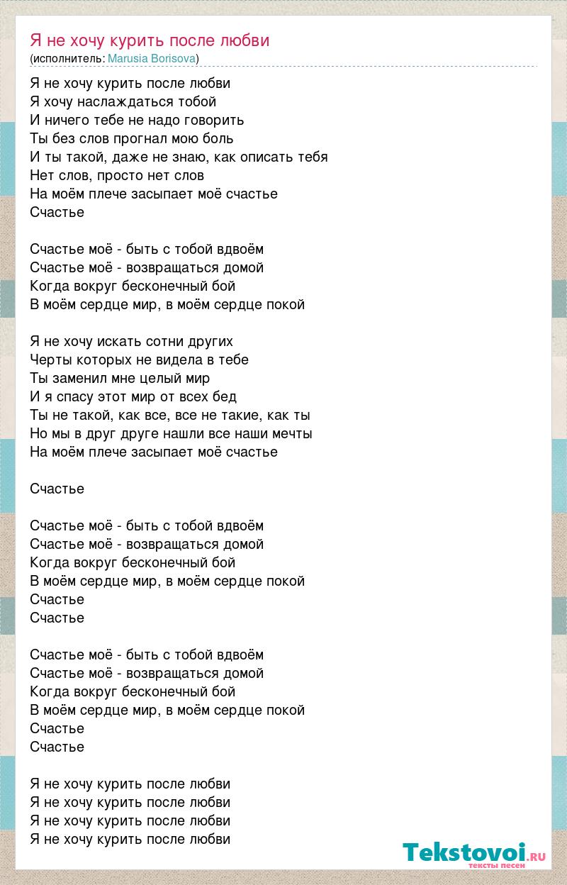 Я не хочу курить после любви Я хочу наслаждаться тобой И ничего тебе не надо говорить Ты без слов прогнал мою боль И ты такой, даже не знаю, как описать тебя Нет слов, просто нет слов На моём плече засыпает моё счастье Счастье Счастье моё - быть с тобой вдвоём Счастье моё - возвращаться домой Когда вокруг бесконечный бой В моём сердце мир, в моём сердце покой Я не хочу искать сотни других Черты которых не видела в тебе Ты заменил мне целый мир И я спасу этот мир от всех бед Ты не такой, как все, все не такие, как ты Но мы в друг друге нашли все наши мечты На моём плече засыпает моё счастье Счастье Счастье моё - быть с тобой вдвоём Счастье моё - возвращаться домой Когда вокруг бесконечный бой В моём сердце мир, в моём сердце покой Счастье Счастье Счастье моё - быть с тобой вдвоём Счастье моё - возвращаться домой Когда вокруг бесконечный бой В моём сердце мир, в моём сердце покой Счастье Счастье Я не хочу курить после любви Я не хочу курить после любви Я не хочу курить после любви Я не хочу курить после любви