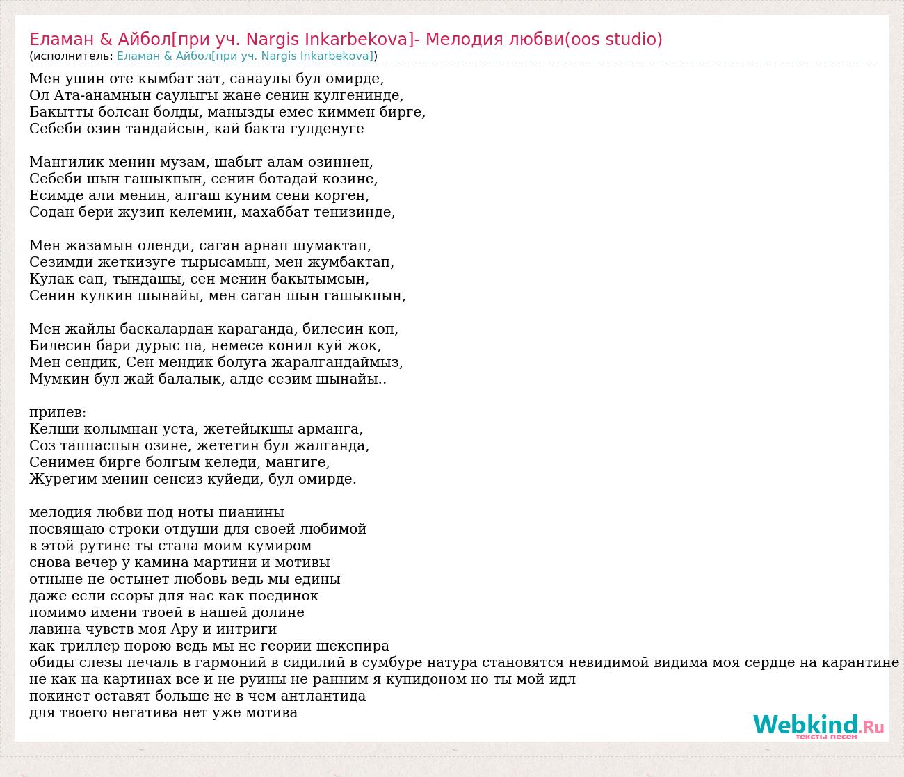Мен ушин оте кымбат зат, санаулы бул омирде, Ол Ата-анамнын саулыгы жане сенин кулгенинде, Бакытты болсан болды, манызды емес киммен бирге, Себеби озин тандайсын, кай бакта гулденуге Мангилик менин музам, шабыт алам озиннен, Себеби шын гашыкпын, сенин ботадай козине, Есимде али менин, алгаш куним сени корген, Содан бери жузип келемин, махаббат тенизинде, Мен жазамын оленди, саган арнап шумактап, Сезимди жеткизуге тырысамын, мен жумбактап, Кулак сап, тындашы, сен менин бакытымсын, Сенин кулкин шынайы, мен саган шын гашыкпын, Мен жайлы баскалардан караганда, билесин коп, Билесин бари дурыс па, немесе конил куй жок, Мен сендик, Сен мендик болуга жаралгандаймыз, Мумкин бул жай балалык, алде сезим шынайы.. припев: Келши колымнан уста, жетейыкшы арманга, Соз таппаспын озине, жететин бул жалганда, Сенимен бирге болгым келеди, мангиге, Журегим менин сенсиз куйеди, бул омирде. мелодия любви под ноты пианины посвящаю строки отдуши для своей любимой в этой рутине ты стала моим кумиром снова вечер у камина мартини и мотивы отныне не остынет любовь ведь мы едины даже если ссоры для нас как поединок помимо имени твоей в нашей долине лавина чувств моя Ару и интриги как триллер порою ведь мы не геории шекспира обиды слезы печаль в гармоний в сидилий в сумбуре натура становятся невидимой видима моя сердце на карантине не как на картинах все и не руины не ранним я купидоном но ты мой идл покинет оставят больше не в чем антлантида для твоего негатива нет уже мотива
