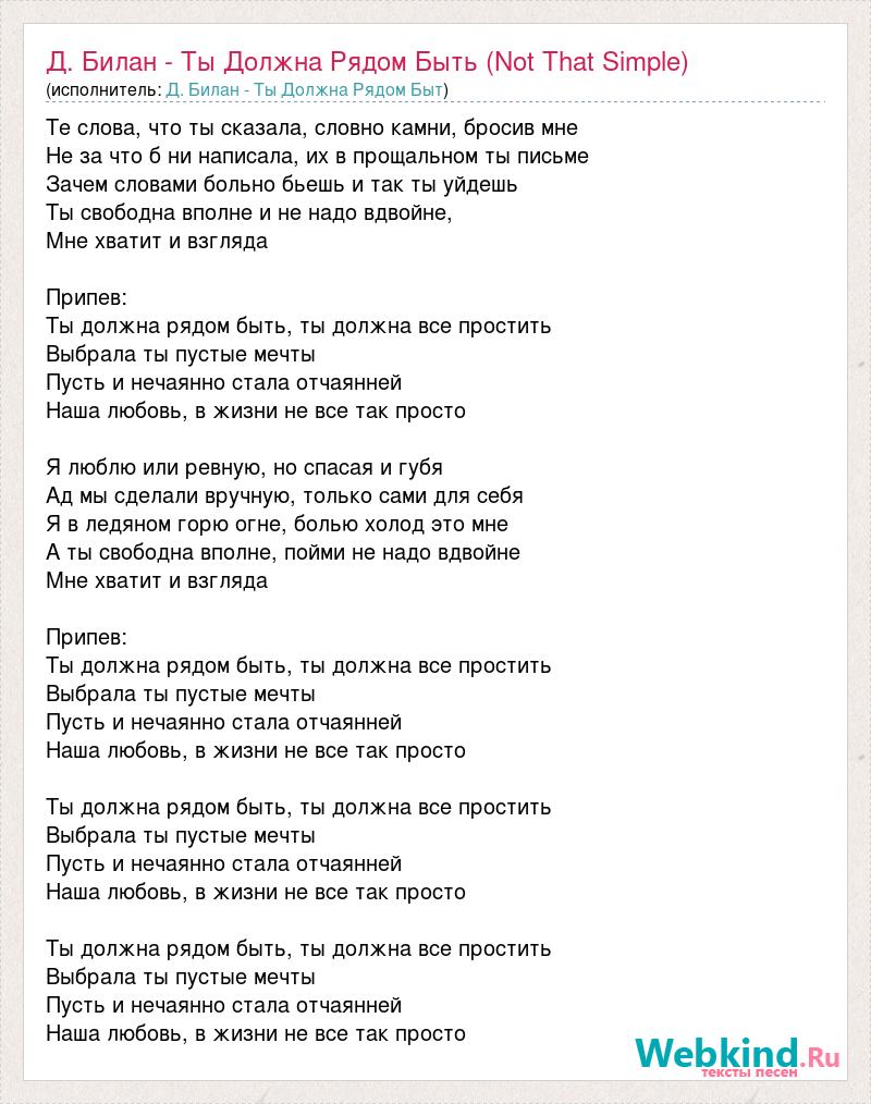 Те слова, что ты сказала, словно камни, бросив мне Не за что б ни написала, их в прощальном ты письме Зачем словами больно бьешь и так ты уйдешь Ты свободна вполне и не надо вдвойне, Мне хватит и взгляда Припев: Ты должна рядом быть, ты должна все простить Выбрала ты пустые мечты Пусть и нечаянно стала отчаянней Наша любовь, в жизни не все так просто Я люблю или ревную, но спасая и губя Ад мы сделали вручную, только сами для себя Я в ледяном горю огне, болью холод это мне А ты свободна вполне, пойми не надо вдвойне Мне хватит и взгляда Припев: Ты должна рядом быть, ты должна все простить Выбрала ты пустые мечты Пусть и нечаянно стала отчаянней Наша любовь, в жизни не все так просто Ты должна рядом быть, ты должна все простить Выбрала ты пустые мечты Пусть и нечаянно стала отчаянней Наша любовь, в жизни не все так просто Ты должна рядом быть, ты должна все простить Выбрала ты пустые мечты Пусть и нечаянно стала отчаянней Наша любовь, в жизни не все так просто