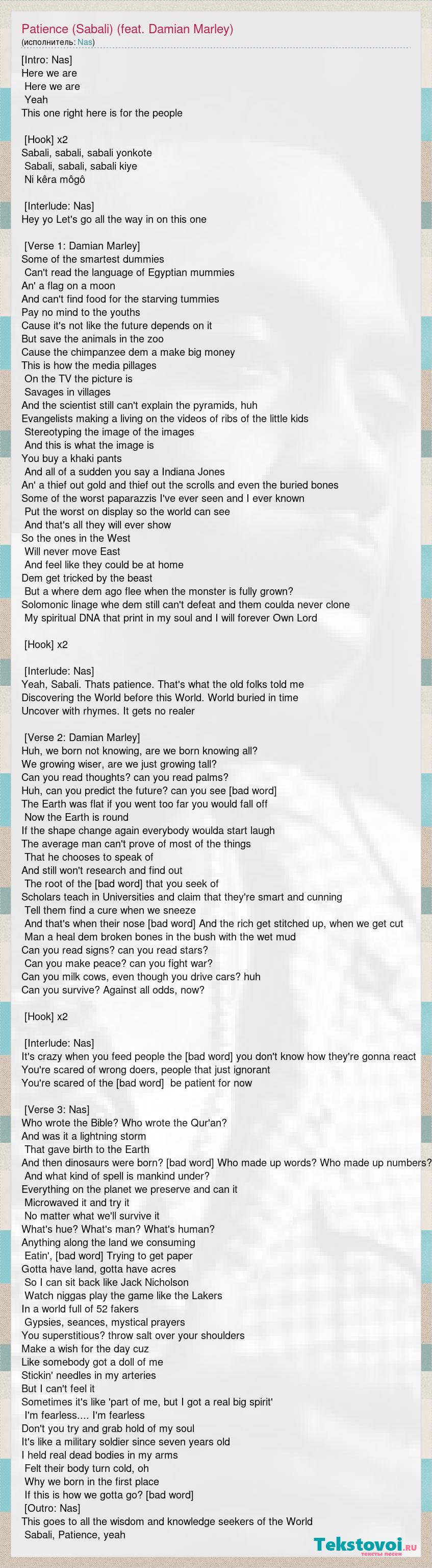 [Intro: Nas] Here we are Here we are Yeah This one right here is for the people [Hook] x2 Sabali, sabali, sabali yonkote Sabali, sabali, sabali kiye Ni kêra môgô [Interlude: Nas] Hey yo Let's go all the way in on this one [Verse 1: Damian Marley] Some of the smartest dummies Can't read the language of Egyptian mummies An' a flag on a moon And can't find food for the starving tummies Pay no mind to the youths Cause it's not like the future depends on it But save the animals in the zoo Cause the chimpanzee dem a make big money This is how the media pillages On the TV the picture is Savages in villages And the scientist still can't explain the pyramids, huh Evangelists making a living on the videos of ribs of the little kids Stereotyping the image of the images And this is what the image is You buy a khaki pants And all of a sudden you say a Indiana Jones An' a thief out gold and thief out the scrolls and even the buried bones Some of the worst paparazzis I've ever seen and I ever known Put the worst on display so the world can see And that's all they will ever show So the ones in the West Will never move East And feel like they could be at home Dem get tricked by the beast But a where dem ago flee when the monster is fully grown? Solomonic linage whe dem still can't defeat and them coulda never clone My spiritual DNA that print in my soul and I will forever Own Lord [Hook] x2 [Interlude: Nas] Yeah, Sabali. Thats patience. That's what the old folks told me Discovering the World before this World. World buried in time Uncover with rhymes. It gets no realer [Verse 2: Damian Marley] Huh, we born not knowing, are we born knowing all? We growing wiser, are we just growing tall? Can you read thoughts? can you read palms? Huh, can you predict the future? can you see [bad word] The Earth was flat if you went too far you would fall off Now the Earth is round If the shape change again everybody woulda start laugh The average man can't prove of most of the things That he chooses to speak of And still won't research and find out The root of the [bad word] that you seek of Scholars teach in Universities and claim that they're smart and cunning Tell them find a cure when we sneeze And that's when their nose [bad word] And the rich get stitched up, when we get cut Man a heal dem broken bones in the bush with the wet mud Can you read signs? can you read stars? Can you make peace? can you fight war? Can you milk cows, even though you drive cars? huh Can you survive? Against all odds, now? [Hook] x2 [Interlude: Nas] It's crazy when you feed people the [bad word] you don't know how they're gonna react You're scared of wrong doers, people that just ignorant You're scared of the [bad word] be patient for now [Verse 3: Nas] Who wrote the Bible? Who wrote the Qur'an? And was it a lightning storm That gave birth to the Earth And then dinosaurs were born? [bad word] Who made up words? Who made up numbers? And what kind of spell is mankind under? Everything on the planet we preserve and can it Microwaved it and try it No matter what we'll survive it What's hue? What's man? What's human? Anything along the land we consuming Eatin', [bad word] Trying to get paper Gotta have land, gotta have acres So I can sit back like Jack Nicholson Watch niggas play the game like the Lakers In a world full of 52 fakers Gypsies, seances, mystical prayers You superstitious? throw salt over your shoulders Make a wish for the day cuz Like somebody got a doll of me Stickin' needles in my arteries But I can't feel it Sometimes it's like 'part of me, but I got a real big spirit' I'm fearless.... I'm fearless Don't you try and grab hold of my soul It's like a military soldier since seven years old I held real dead bodies in my arms Felt their body turn cold, oh Why we born in the first place If this is how we gotta go? [bad word] [Outro: Nas] This goes to all the wisdom and knowledge seekers of the World Sabali, Patience, yeah