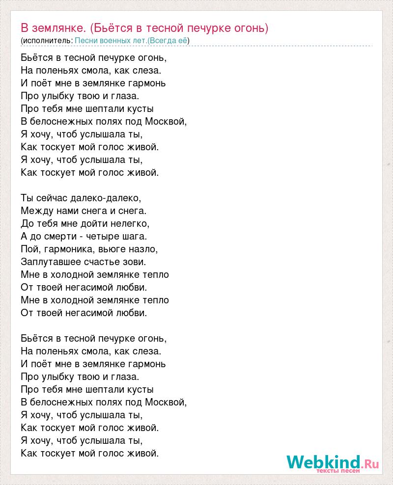 Бьётся в тесной печурке огонь, На поленьях смола, как слеза. И поёт мне в землянке гармонь Про улыбку твою и глаза. Про тебя мне шептали кусты В белоснежных полях под Москвой, Я хочу, чтоб услышала ты, Как тоскует мой голос живой. Я хочу, чтоб услышала ты, Как тоскует мой голос живой. Ты сейчас далеко-далеко, Между нами снега и снега. До тебя мне дойти нелегко, А до смерти - четыре шага. Пой, гармоника, вьюге назло, Заплутавшее счастье зови. Мне в холодной землянке тепло От твоей негасимой любви. Мне в холодной землянке тепло От твоей негасимой любви. Бьётся в тесной печурке огонь, На поленьях смола, как слеза. И поёт мне в землянке гармонь Про улыбку твою и глаза. Про тебя мне шептали кусты В белоснежных полях под Москвой, Я хочу, чтоб услышала ты, Как тоскует мой голос живой. Я хочу, чтоб услышала ты, Как тоскует мой голос живой.