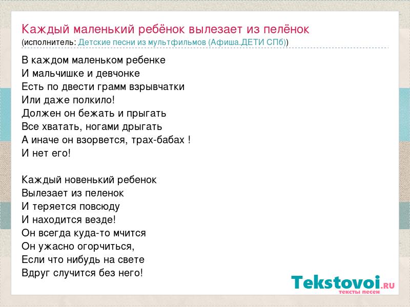 Главная→Исполнители→Детские песни из мультфильмов (Афиша.ДЕТИ СПб)→Каждый маленький ребёнок вылезает из пелёнок