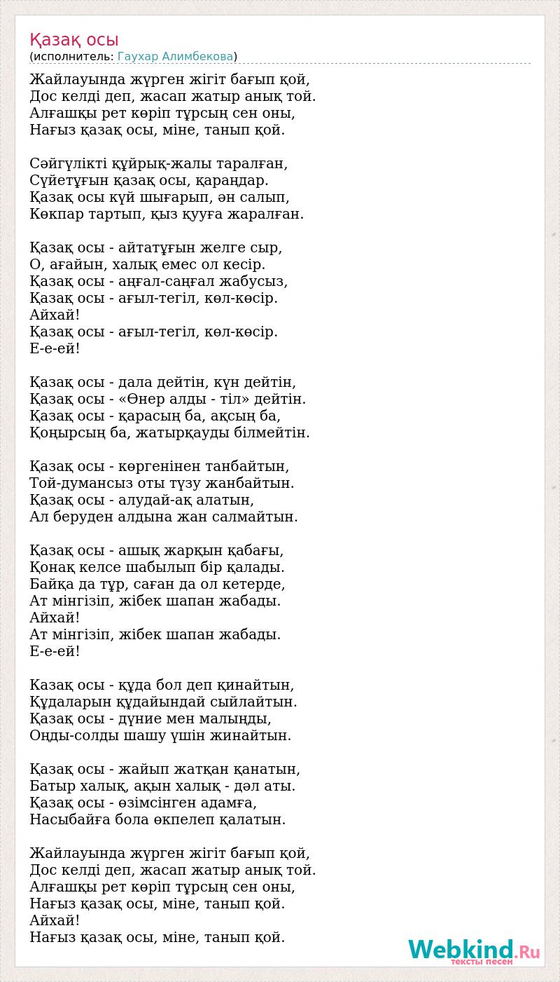 Жайлауында жүрген жігіт бағып қой, Дос келді деп, жасап жатыр анық той. Алғашқы рет көріп тұрсың сен оны, Нағыз қазақ осы, міне, танып қой. Сәйгүлікті құйрық-жалы таралған, Сүйетұғын қазақ осы, қараңдар. Қазақ осы күй шығарып, ән салып, Көкпар тартып, қыз қууға жаралған. Қазақ осы - айтатұғын желге сыр, О, ағайын, халық емес ол кесір. Қазақ осы - аңғал-саңғал жабусыз, Қазақ осы - ағыл-тегіл, көл-көсір. Айхай! Қазақ осы - ағыл-тегіл, көл-көсір. Е-е-ей! Қазақ осы - дала дейтін, күн дейтін, Қазақ осы - «Өнер алды - тіл» дейтін. Қазақ осы - қарасың ба, ақсың ба, Қоңырсың ба, жатырқауды білмейтін. Қазақ осы - көргенінен танбайтын, Той-думансыз оты түзу жанбайтын. Қазақ осы - алудай-ақ алатын, Ал беруден алдына жан салмайтын. Қазақ осы - ашық жарқын қабағы, Қонақ келсе шабылып бір қалады. Байқа да тұр, саған да ол кетерде, Ат мінгізіп, жібек шапан жабады. Айхай! Ат мінгізіп, жібек шапан жабады. Е-е-ей! Казақ осы - құда бол деп қинайтын, Құдаларын құдайындай сыйлайтын. Қазақ осы - дүние мен малыңды, Оңды-солды шашу үшін жинайтын. Қазақ осы - жайып жатқан қанатын, Батыр халық, ақын халық - дәл аты. Қазақ осы - өзімсінген адамға, Насыбайға бола өкпелеп қалатын. Жайлауында жүрген жігіт бағып қой, Дос келді деп, жасап жатыр анық той. Алғашқы рет көріп тұрсың сен оны, Нағыз қазақ осы, міне, танып қой. Айхай! Нағыз қазақ осы, міне, танып қой.