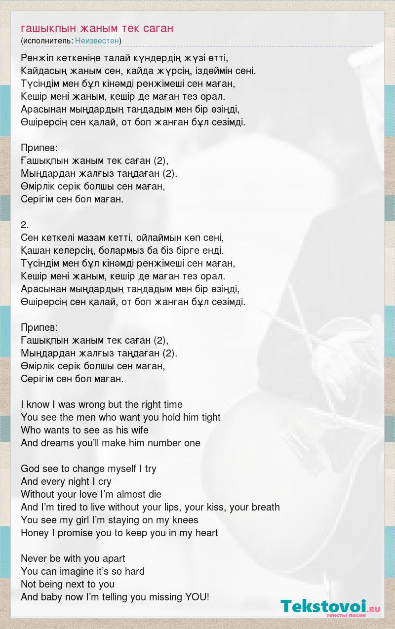 Ренжіп кеткеніңе талай күндердің жүзі өтті, Кайдасың жаным сен, кайда жүрсің, іздеймін сені. Түсіндім мен бұл кінәмді ренжімеші сен маған, Кешір мені жаным, кешір де маған тез орал. Арасынан мыңдардың таңдадым мен бір өзіңді, Өшірерсің сен қалай, от боп жанған бұл сезімді. Припев: Ғашықпын жаным тек саған (2), Мыңдардан жалғыз таңдаған (2). Өмірлік серік болшы сен маған, Серігім сен бол маған. 2. Сен кеткелі мазам кетті, ойлаймын көп сені, Қашан келерсің, болармыз ба біз бірге енді. Түсіндім мен бұл кінәмді ренжімеші сен маған, Кешір мені жаным, кешір де маған тез орал. Арасынан мыңдардың таңдадым мен бір өзіңді, Өшірерсің сен қалай, от боп жанған бұл сезімді. Припев: Ғашықпын жаным тек саған (2), Мыңдардан жалғыз таңдаған (2). Өмірлік серік болшы сен маған, Серігім сен бол маған. I know I was wrong but the right time You see the men who want you hold him tight Who wants to see as his wife And dreams you’ll make him number one God see to change myself I try And every night I cry Without your love I’m almost die And I’m tired to live without your lips, your kiss, your breath You see my girl I’m staying on my knees Honey I promise you to keep you in my heart Never be with you apart You can imagine it’s so hard Not being next to you And baby now I’m telling you missing YOU!
