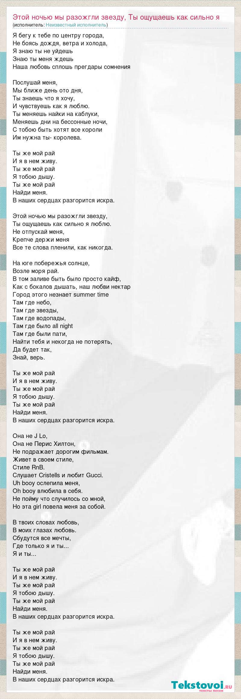 Я бегу к тебе по центру города, Не боясь дождя, ветра и холода, Я знаю ты не уйдешь Знаю ты меня ждешь Наша любовь сплошь прегдары сомнения Послушай меня, Мы ближе день ото дня, Ты знаешь что я хочу, И чувствуешь как я люблю. Ты меняешь найки на каблуки, Меняешь дни на бессонные ночи, С тобою быть хотят все короли Им нужна ты- королева. Ты же мой рай И я в нем живу. Ты же мой рай Я тобою дышу. Ты же мой рай Найди меня. В наших сердцах разгорится искра. Этой ночью мы разожгли звезду, Ты ощущаешь как сильно я люблю. Не отпускай меня, Крепче держи меня Все те слова пленили, как никогда. На юге побережья cолнце, Возле моря рай. В том заливе быть было просто кайф, Как с бокалов дышать, наш любви нектар Город этого незнает summer time Там где небо, Там где звезды, Там где водопады, Там где было all night Там где были пати, Найти тебя и некогда не потерять, Да будет так, Знай, верь. Ты же мой рай И я в нем живу. Ты же мой рай Я тобою дышу. Ты же мой рай Найди меня. В наших сердцах разгорится искра. Она не J Lo, Она не Перис Хилтон, Не подражает дорогим фильмам. Живет в своем стиле, Стиле RnB. Cлушает Cristells и любит Gucci. Uh booy ослепила меня, Оh booy влюбила в себя. Не пойму что случилось со мной, Но эта girl повела меня за собой. В твоих словах любовь, В моих глазах любовь. Сбудутся все мечты, Где только я и ты... Я и ты... Ты же мой рай И я в нем живу. Ты же мой рай Я тобою дышу. Ты же мой рай Найди меня. В наших сердцах разгорится искра. Ты же мой рай И я в нем живу. Ты же мой рай Я тобою дышу. Ты же мой рай Найди меня. В наших сердцах разгорится искра.