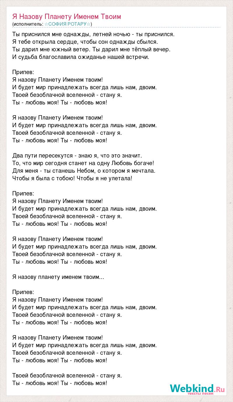 Ты приснился мне однажды, летней ночью - ты приснился. Я тебе открыла сердце, чтобы сон однажды сбылся. Ты дарил мне южный ветер. Ты дарил мне тёплый вечер. И судьба благославила ожиданье нашей встречи. Припев: Я назову Планету Именем твоим! И будет мир принадлежать всегда лишь нам, двоим. Твоей безоблачной вселенной - стану я. Ты - любовь моя! Ты - любовь моя! Я назову Планету Именем твоим! И будет мир принадлежать всегда лишь нам, двоим. Твоей безоблачной вселенной - стану я. Ты - любовь моя! Ты - любовь моя! Два пути пересекутся - знаю я, что это значит. То, что мир сегодня станет на одну Любовь богаче! Для меня - ты станешь Небом, о котором я мечтала. Чтобы я была с тобою! Чтобы я не улетала! Припев: Я назову Планету Именем твоим! И будет мир принадлежать всегда лишь нам, двоим. Твоей безоблачной вселенной - стану я. Ты - любовь моя! Ты - любовь моя! Я назову Планету Именем твоим! И будет мир принадлежать всегда лишь нам, двоим. Твоей безоблачной вселенной - стану я. Ты - любовь моя! Ты - любовь моя! Я назову планету именем твоим... Припев: Я назову Планету Именем твоим! И будет мир принадлежать всегда лишь нам, двоим. Твоей безоблачной вселенной - стану я. Ты - любовь моя! Ты - любовь моя! Я назову Планету Именем твоим! И будет мир принадлежать всегда лишь нам, двоим. Твоей безоблачной вселенной - стану я. Ты - любовь моя! Ты - любовь моя! Твоей безоблачной вселенной - стану я. Ты - любовь моя! Ты - любовь моя!
