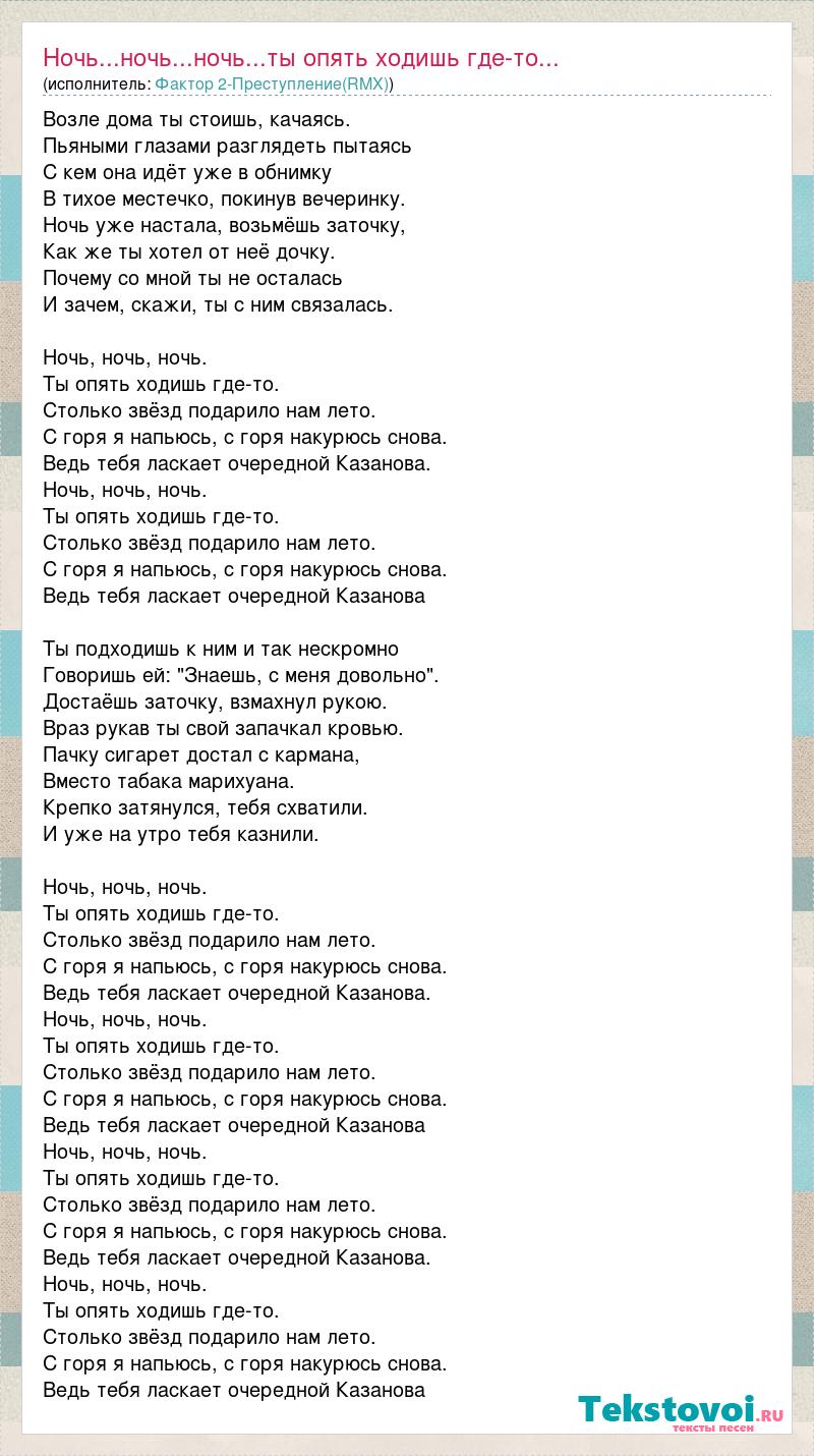 Возле дома ты стоишь, качаясь. Пьяными глазами разглядеть пытаясь С кем она идёт уже в обнимку В тихое местечко, покинув вечеринку. Ночь уже настала, возьмёшь заточку, Как же ты хотел от неё дочку. Почему со мной ты не осталась И зачем, скажи, ты с ним связалась. Ночь, ночь, ночь. Ты опять ходишь где-то. Столько звёзд подарило нам лето. С горя я напьюсь, с горя накурюсь снова. Ведь тебя ласкает очередной Казанова. Ночь, ночь, ночь. Ты опять ходишь где-то. Столько звёзд подарило нам лето. С горя я напьюсь, с горя накурюсь снова. Ведь тебя ласкает очередной Казанова Ты подходишь к ним и так нескромно Говоришь ей: "Знаешь, с меня довольно". Достаёшь заточку, взмахнул рукою. Враз рукав ты свой запачкал кровью. Пачку сигарет достал с кармана, Вместо табака марихуана. Крепко затянулся, тебя схватили. И уже на утро тебя казнили. Ночь, ночь, ночь. Ты опять ходишь где-то. Столько звёзд подарило нам лето. С горя я напьюсь, с горя накурюсь снова. Ведь тебя ласкает очередной Казанова. Ночь, ночь, ночь. Ты опять ходишь где-то. Столько звёзд подарило нам лето. С горя я напьюсь, с горя накурюсь снова. Ведь тебя ласкает очередной Казанова Ночь, ночь, ночь. Ты опять ходишь где-то. Столько звёзд подарило нам лето. С горя я напьюсь, с горя накурюсь снова. Ведь тебя ласкает очередной Казанова. Ночь, ночь, ночь. Ты опять ходишь где-то. Столько звёзд подарило нам лето. С горя я напьюсь, с горя накурюсь снова. Ведь тебя ласкает очередной Казанова