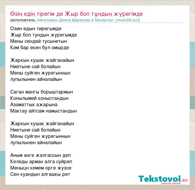 Озин едын тирегымде Жыр боп тундын журегымде Мены сендей тусынетын Ким бар екен бул омырде Жаркын кушак жайганайын Ниетыне сай болайын Мены суйген журегыннын лупылынен айналайын Саган мангы борыштармын Конылымей коныстандын Азаматтык ажарына Мактау айтсам намыстандын Жаркын кушак жайганайын Ниетыне сай болайын Мены суйген журегыннын лупылынен айналайын Аным анге жалгассын деп Келеды арман алга суйреп Меныцн кемем орге жузсе Сен куандын алгашкы рет