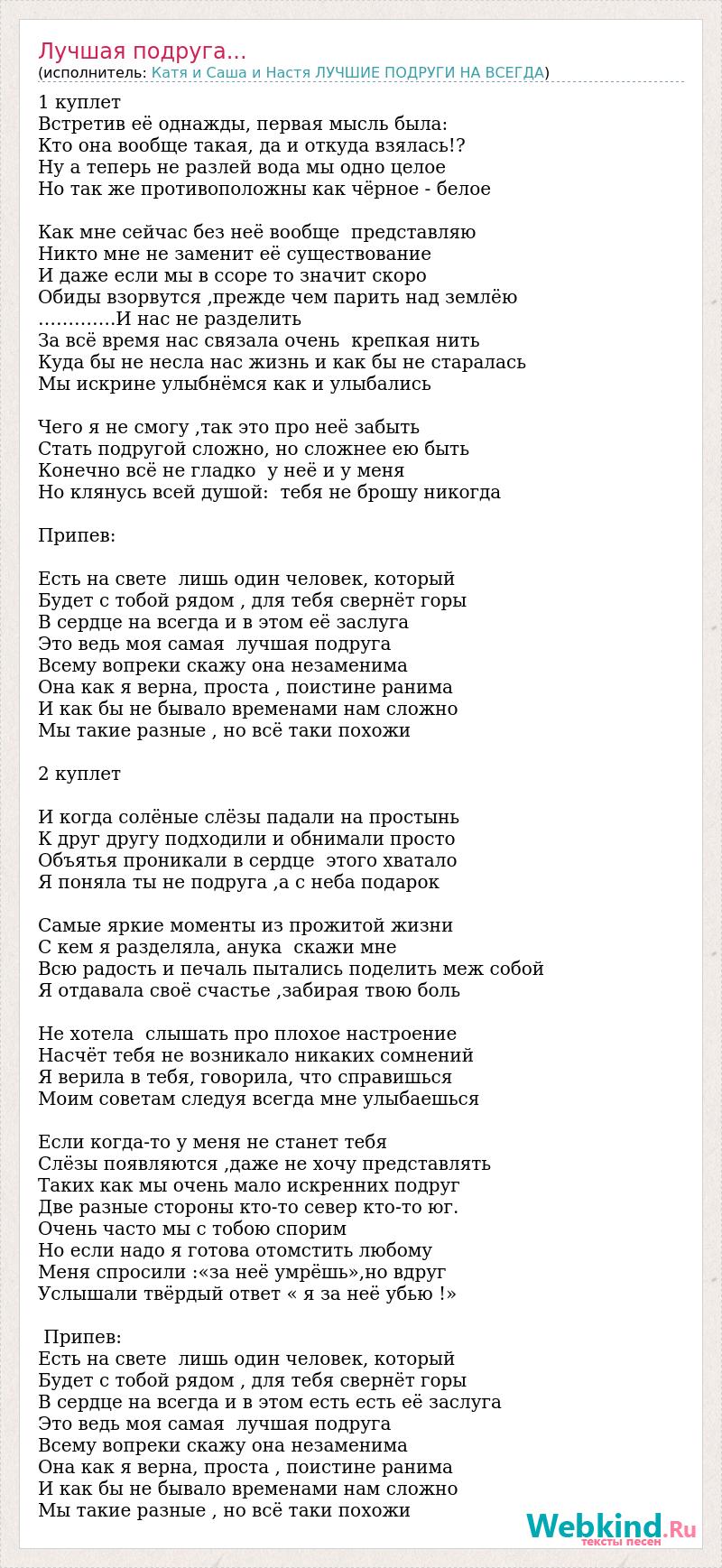 1 куплет Встретив её однажды, первая мысль была: Кто она вообще такая, да и откуда взялась!? Ну а теперь не разлей вода мы одно целое Но так же противоположны как чёрное - белое Как мне сейчас без неё вообще представляю Никто мне не заменит её существование И даже если мы в ссоре то значит скоро Обиды взорвутся ,прежде чем парить над землёю ………….И нас не разделить За всё время нас связала очень крепкая нить Куда бы не несла нас жизнь и как бы не старалась Мы искрине улыбнёмся как и улыбались Чего я не смогу ,так это про неё забыть Стать подругой сложно, но сложнее ею быть Конечно всё не гладко у неё и у меня Но клянусь всей душой: тебя не брошу никогда Припев: Есть на свете лишь один человек, который Будет с тобой рядом , для тебя свернёт горы В сердце на всегда и в этом её заслуга Это ведь моя самая лучшая подруга Всему вопреки скажу она незаменима Она как я верна, проста , поистине ранима И как бы не бывало временами нам сложно Мы такие разные , но всё таки похожи 2 куплет И когда солёные слёзы падали на простынь К друг другу подходили и обнимали просто Объятья проникали в сердце этого хватало Я поняла ты не подруга ,а с неба подарок Самые яркие моменты из прожитой жизни С кем я разделяла, анука скажи мне Всю радость и печаль пытались поделить меж собой Я отдавала своё счастье ,забирая твою боль Не хотела слышать про плохое настроение Насчёт тебя не возникало никаких сомнений Я верила в тебя, говорила, что справишься Моим советам следуя всегда мне улыбаешься Если когда-то у меня не станет тебя Слёзы появляются ,даже не хочу представлять Таких как мы очень мало искренних подруг Две разные стороны кто-то север кто-то юг. Очень часто мы с тобою спорим Но если надо я готова отомстить любому Меня спросили :«за неё умрёшь»,но вдруг Услышали твёрдый ответ « я за неё убью !» Припев: Есть на свете лишь один человек, который Будет с тобой рядом , для тебя свернёт горы В сердце на всегда и в этом есть есть её заслуга Это ведь моя самая лучшая подруга Всему вопреки скажу она незаменима Она как я верна, проста , поистине ранима И как бы не бывало временами нам сложно Мы такие разные , но всё таки похожи