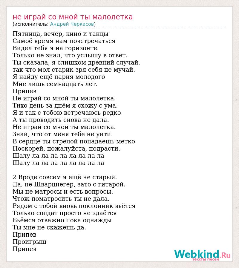 Пятница, вечер, кино и танцы Самоё время нам повстречаться Видел тебя я на горизонте Только не знал, что услышу в ответ. Ты сказала, я слишком древний случай. так что мол старик зря себя не мучай. Я найду ещё парня молодого Мне лишь семнадцать лет. Припев Не играй со мной ты малолетка. Тихо день за днём я схожу с ума. Я и так с тобою встречаюсь редко А ты проводить снова не дала. Не играй со мной ты малолетка. Знай, что от меня тебе не уйти. В сердце ты стрелой попадаешь метко Поскорей, пожалуйста, подрасти. Шалу ла ла ла ла ла ла ла ла Шалу ла ла ла ла ла ла ла ла 2 Вроде совсем я ещё не старый. Да, не Шварцнегер, зато с гитарой. Мы не матросы и есть вопросы. Чтож поматросить ты не дала. Рядом с тобой вновь поклонник вьётся Только солдат просто не здаётся Бьёмся отважно пока однажды Ты мне не скажешь да. Припев Проигрыш Припев