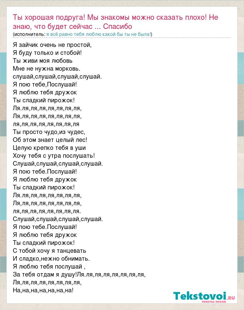 Я зайчик очень не простой, Я буду только и стобой! Ты живи моя любовь Мне не нужна морковь. слушай,слушай,слушай,слушай. Я пою тебе,Послушай! Я люблю тебя дружок Ты сладкий пирожок! Ля.ля,ля,ля,ля,ля,ля,ля, Ля,ля,ля,ля,ля,ля,ля,ля, ля,ля,ля,ля,ля,ля,ля,ля Ты просто чудо,из чудес, Об этом знает целый лес! Целую крепко тебя в уши Хочу тебя с утра послушать! Слушай,слушай,слушай,слушай. Я пою тебе.Послушай! Я люблю тебя дружок Ты сладкий пирожок! Ля.ля,ля,ля,ля,ля,ля,ля, Ля,ля,ля,ля,ля,ля,ля,ля, ля,ля,ля,ля,ля,ля,ля,ля. Слушай,слушай,слушай,слушай. Я пою тебе.Послушай! Я люблю тебя дружок Ты сладкий пирожок! С тобой хочу я танцевать И сладко,нежно обнимать. Я люблю тебя послушай , За тебя отдам я душу!Ля.ля,ля,ля,ля,ля,ля,ля, Ля,ля,ля,ля,ля,ля,ля,ля, На,на,на,на,на,на,на!