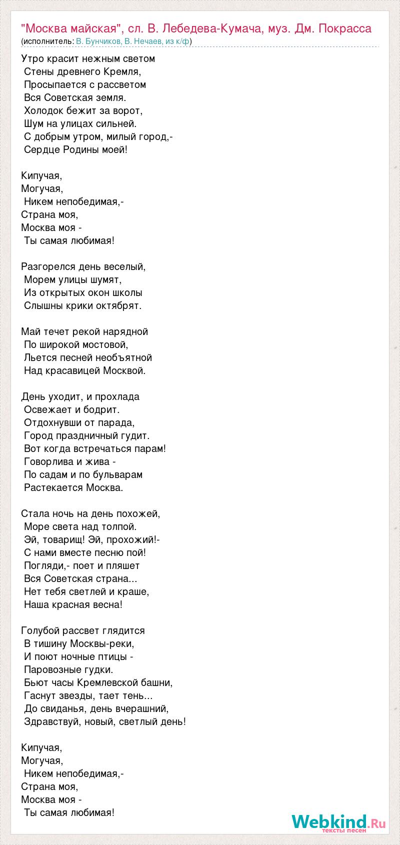 Утро красит нежным светом Стены древнего Кремля, Просыпается с рассветом Вся Советская земля. Холодок бежит за ворот, Шум на улицах сильней. С добрым утром, милый город,- Сердце Родины моей! Кипучая, Могучая, Никем непобедимая,- Страна моя, Москва моя - Ты самая любимая! Разгорелся день веселый, Морем улицы шумят, Из открытых окон школы Слышны крики октябрят. Май течет рекой нарядной По широкой мостовой, Льется песней необъятной Над красавицей Москвой. День уходит, и прохлада Освежает и бодрит. Отдохнувши от парада, Город праздничный гудит. Вот когда встречаться парам! Говорлива и жива - По садам и по бульварам Растекается Москва. Стала ночь на день похожей, Море света над толпой. Эй, товарищ! Эй, прохожий!- С нами вместе песню пой! Погляди,- поет и пляшет Вся Советская страна... Нет тебя светлей и краше, Наша красная весна! Голубой рассвет глядится В тишину Москвы-реки, И поют ночные птицы - Паровозные гудки. Бьют часы Кремлевской башни, Гаснут звезды, тает тень... До свиданья, день вчерашний, Здравствуй, новый, светлый день! Кипучая, Могучая, Никем непобедимая,- Страна моя, Москва моя - Ты самая любимая!