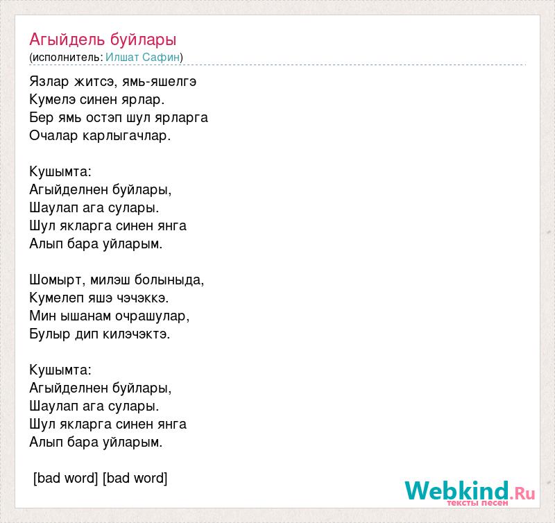 Язлар житсэ, ямь-яшелгэ Кумелэ синен ярлар. Бер ямь остэп шул ярларга Очалар карлыгачлар. Кушымта: Агыйделнен буйлары, Шаулап ага сулары. Шул якларга синен янга Алып бара уйларым. Шомырт, милэш болыныда, Кумелеп яшэ чэчэккэ. Мин ышанам очрашулар, Булыр дип килэчэктэ. Кушымта: Агыйделнен буйлары, Шаулап ага сулары. Шул якларга синен янга Алып бара уйларым. [bad word] [bad word]