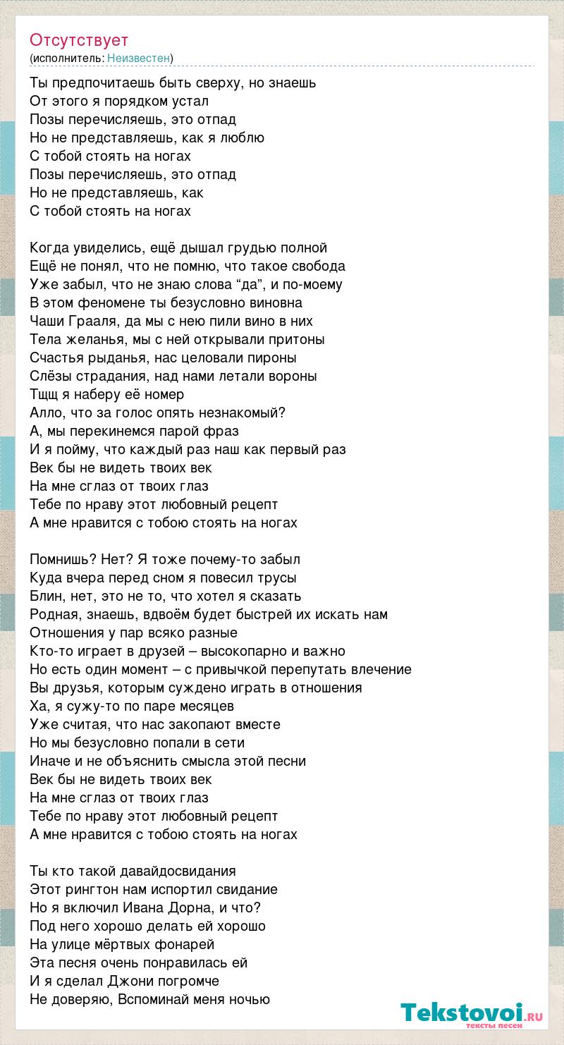 Ты предпочитаешь быть сверху, но знаешь От этого я порядком устал Позы перечисляешь, это отпад Но не представляешь, как я люблю С тобой стоять на ногах Позы перечисляешь, это отпад Но не представляешь, как С тобой стоять на ногах Когда увиделись, ещё дышал грудью полной Ещё не понял, что не помню, что такое свобода Уже забыл, что не знаю слова “да”, и по-моему В этом феномене ты безусловно виновна Чаши Грааля, да мы с нею пили вино в них Тела желанья, мы с ней открывали притоны Счастья рыданья, нас целовали пироны Слёзы страдания, над нами летали вороны Тщщ я наберу её номер Алло, что за голос опять незнакомый? А, мы перекинемся парой фраз И я пойму, что каждый раз наш как первый раз Век бы не видеть твоих век На мне сглаз от твоих глаз Тебе по нраву этот любовный рецепт А мне нравится с тобою стоять на ногах Помнишь? Нет? Я тоже почему-то забыл Куда вчера перед сном я повесил трусы Блин, нет, это не то, что хотел я сказать Родная, знаешь, вдвоём будет быстрей их искать нам Отношения у пар всяко разные Кто-то играет в друзей – высокопарно и важно Но есть один момент – с привычкой перепутать влечение Вы друзья, которым суждено играть в отношения Ха, я сужу-то по паре месяцев Уже считая, что нас закопают вместе Но мы безусловно попали в сети Иначе и не объяснить смысла этой песни Век бы не видеть твоих век На мне сглаз от твоих глаз Тебе по нраву этот любовный рецепт А мне нравится с тобою стоять на ногах Ты кто такой давайдосвидания Этот рингтон нам испортил свидание Но я включил Ивана Дорна, и что? Под него хорошо делать ей хорошо На улице мёртвых фонарей Эта песня очень понравилась ей И я сделал Джони погромче Не доверяю, Вспоминай меня ночью