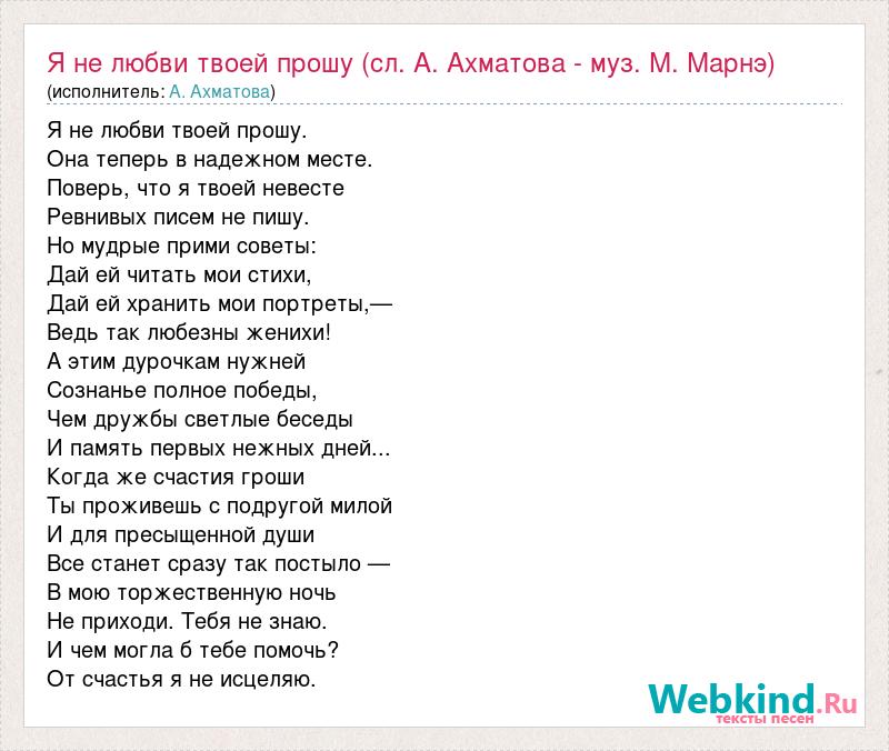 А как ты думаешь, о чем песня "Я не любви твоей прошу (сл. А. Ахматова - муз. М. Марнэ)" ?