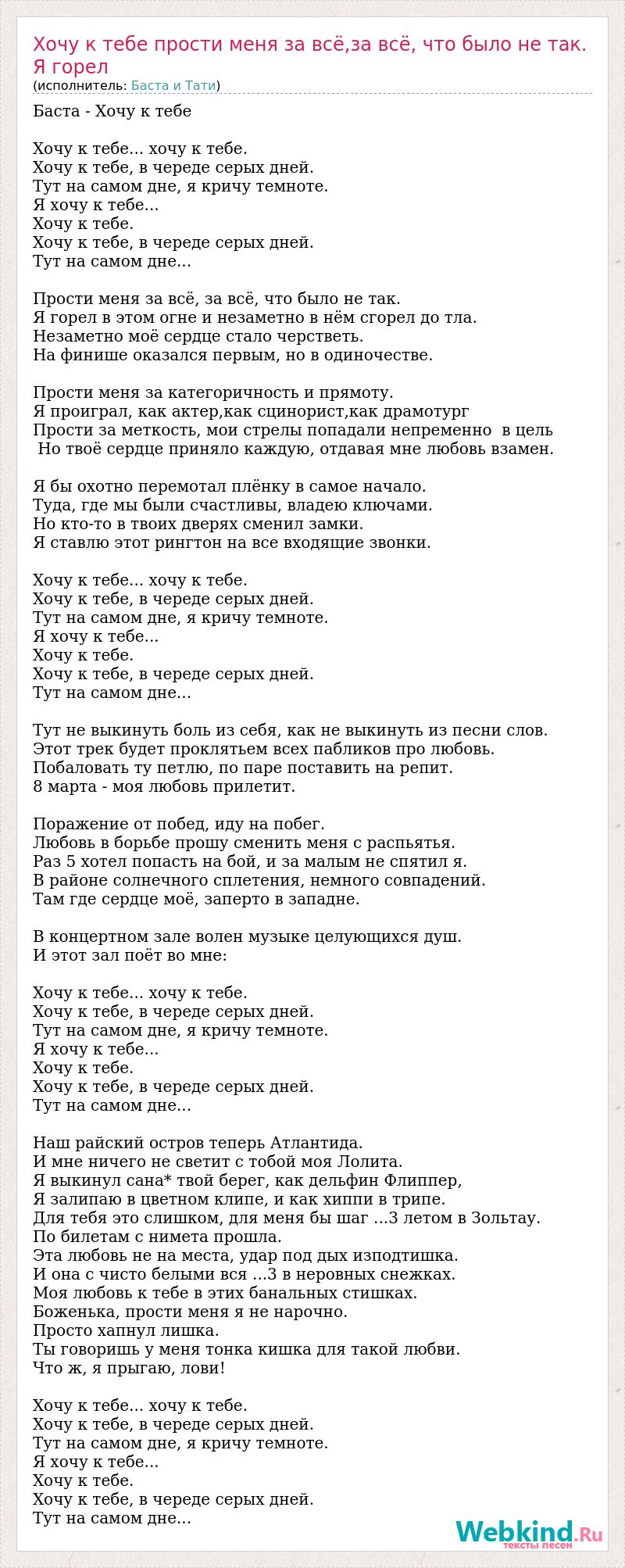 Баста - Хочу к тебе Хочу к тебе... хочу к тебе. Хочу к тебе, в череде серых дней. Тут на самом дне, я кричу темноте. Я хочу к тебе... Хочу к тебе. Хочу к тебе, в череде серых дней. Тут на самом дне... Прости меня за всё, за всё, что было не так. Я горел в этом огне и незаметно в нём сгорел до тла. Незаметно моё сердце стало черстветь. На финише оказался первым, но в одиночестве. Прости меня за категоричность и прямоту. Я проиграл, как актер,как сцинорист,как драмотург Прости за меткость, мои стрелы попадали непременно в цель Но твоё сердце приняло каждую, отдавая мне любовь взамен. Я бы охотно перемотал плёнку в самое начало. Туда, где мы были счастливы, владею ключами. Но кто-то в твоих дверях сменил замки. Я ставлю этот рингтон на все входящие звонки. Хочу к тебе... хочу к тебе. Хочу к тебе, в череде серых дней. Тут на самом дне, я кричу темноте. Я хочу к тебе... Хочу к тебе. Хочу к тебе, в череде серых дней. Тут на самом дне... Тут не выкинуть боль из себя, как не выкинуть из песни слов. Этот трек будет проклятьем всех пабликов про любовь. Побаловать ту петлю, по паре поставить на репит. 8 марта - моя любовь прилетит. Поражение от побед, иду на побег. Любовь в борьбе прошу сменить меня с распьятья. Раз 5 хотел попасть на бой, и за малым не спятил я. В районе солнечного сплетения, немного совпадений. Там где сердце моё, заперто в западне. В концертном зале волен музыке целующихся душ. И этот зал поёт во мне: Хочу к тебе... хочу к тебе. Хочу к тебе, в череде серых дней. Тут на самом дне, я кричу темноте. Я хочу к тебе... Хочу к тебе. Хочу к тебе, в череде серых дней. Тут на самом дне... Наш райский остров теперь Атлантида. И мне ничего не светит с тобой моя Лолита. Я выкинул сана* твой берег, как дельфин Флиппер, Я залипаю в цветном клипе, и как хиппи в трипе. Для тебя это слишком, для меня бы шаг ...3 летом в Зольтау. По билетам с нимета прошла. Эта любовь не на места, удар под дых изподтишка. И она с чисто белыми вся ...3 в неровных снежках. Моя любовь к тебе в этих банальных стишках. Боженька, прости меня я не нарочно. Просто хапнул лишка. Ты говоришь у меня тонка кишка для такой любви. Что ж, я прыгаю, лови! Хочу к тебе... хочу к тебе. Хочу к тебе, в череде серых дней. Тут на самом дне, я кричу темноте. Я хочу к тебе... Хочу к тебе. Хочу к тебе, в череде серых дней. Тут на самом дне...