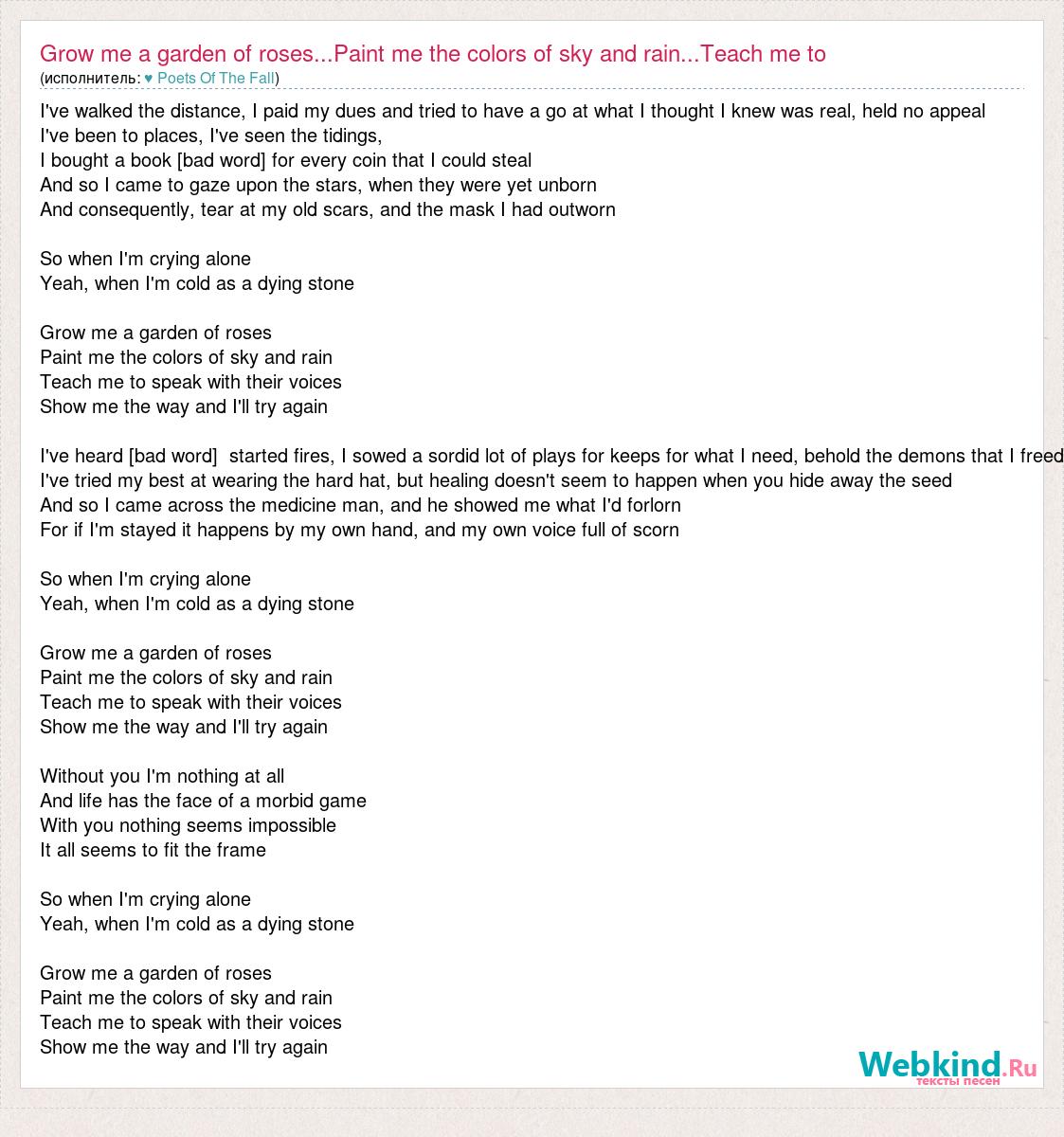 I've walked the distance, I paid my dues and tried to have a go at what I thought I knew was real, held no appeal I've been to places, I've seen the tidings, I bought a book [bad word] for every coin that I could steal And so I came to gaze upon the stars, when they were yet unborn And consequently, tear at my old scars, and the mask I had outworn So when I'm crying alone Yeah, when I'm cold as a dying stone Grow me a garden of roses Paint me the colors of sky and rain Teach me to speak with their voices Show me the way and I'll try again I've heard [bad word] started fires, I sowed a sordid lot of plays for keeps for what I need, behold the demons that I freed I've tried my best at wearing the hard hat, but healing doesn't seem to happen when you hide away the seed And so I came across the medicine man, and he showed me what I'd forlorn For if I'm stayed it happens by my own hand, and my own voice full of scorn So when I'm crying alone Yeah, when I'm cold as a dying stone Grow me a garden of roses Paint me the colors of sky and rain Teach me to speak with their voices Show me the way and I'll try again Without you I'm nothing at all And life has the face of a morbid game With you nothing seems impossible It all seems to fit the frame So when I'm crying alone Yeah, when I'm cold as a dying stone Grow me a garden of roses Paint me the colors of sky and rain Teach me to speak with their voices Show me the way and I'll try again