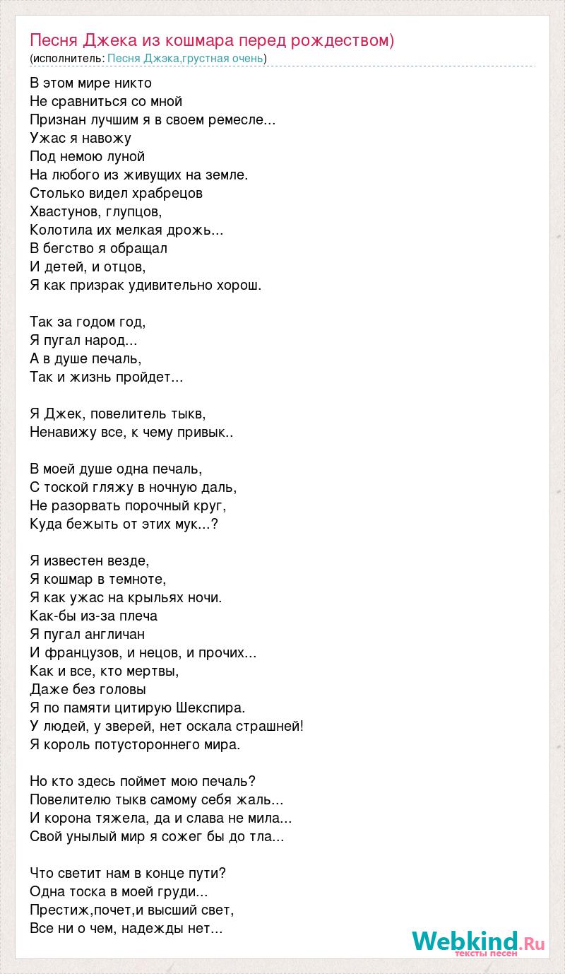 В этом мире никто Не сравниться со мной Признан лучшим я в своем ремесле... Ужас я навожу Под немою луной На любого из живущих на земле. Столько видел храбрецов Хвастунов, глупцов, Колотила их мелкая дрожь... В бегство я обращал И детей, и отцов, Я как призрак удивительно хорош. Так за годом год, Я пугал народ... А в душе печаль, Так и жизнь пройдет... Я Джек, повелитель тыкв, Ненавижу все, к чему привык.. В моей душе одна печаль, С тоской гляжу в ночную даль, Не разорвать порочный круг, Куда бежыть от этих мук...? Я известен везде, Я кошмар в темноте, Я как ужас на крыльях ночи. Как-бы из-за плеча Я пугал англичан И французов, и нецов, и прочих... Как и все, кто мертвы, Даже без головы Я по памяти цитирую Шекспира. У людей, у зверей, нет оскала страшней! Я король потустороннего мира. Но кто здесь поймет мою печаль? Повелителю тыкв самому себя жаль... И корона тяжела, да и слава не мила... Свой унылый мир я сожег бы до тла... Что светит нам в конце пути? Одна тоска в моей груди... Престиж,почет,и высший свет, Все ни о чем, надежды нет...