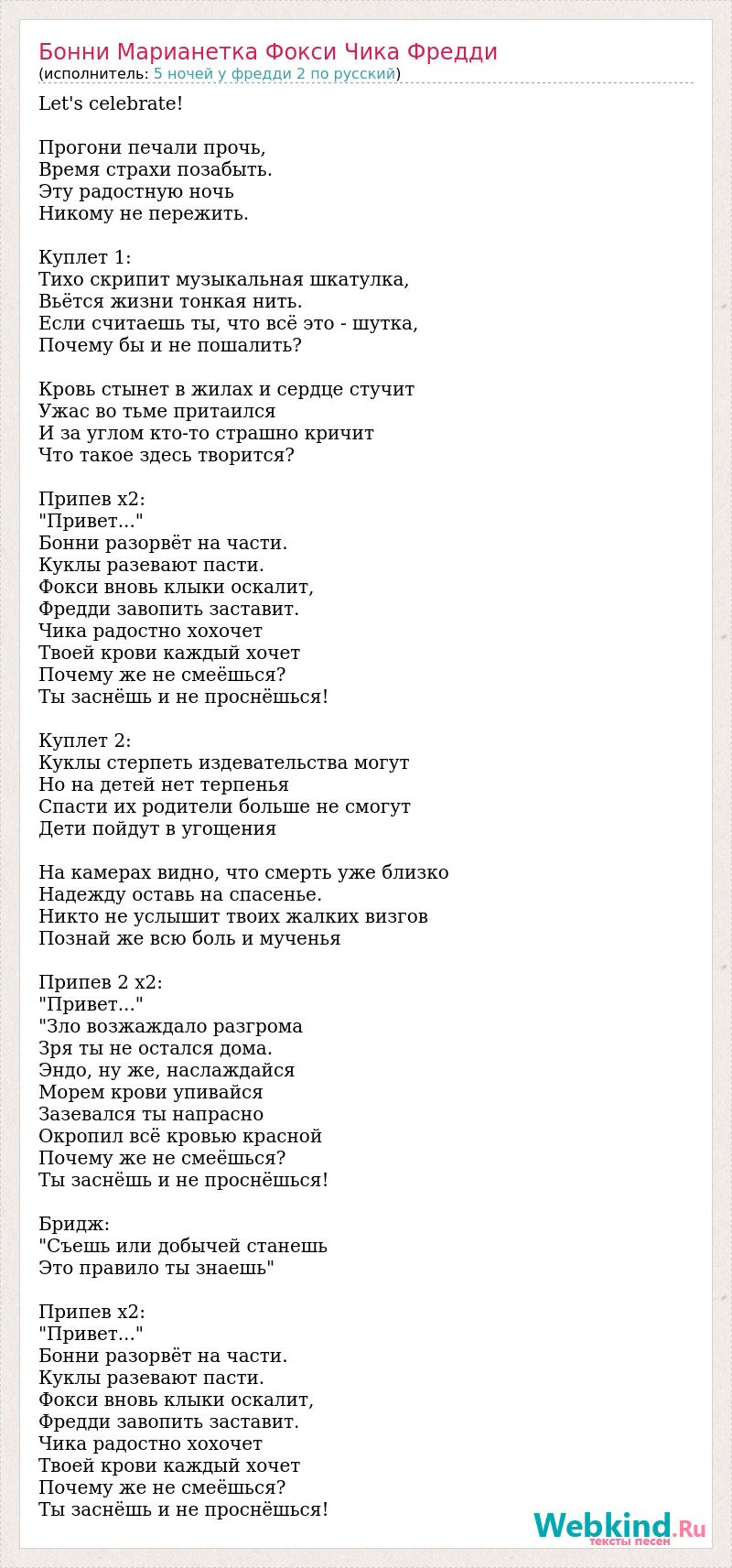 Let's celebrate! Прогони печали прочь, Время страхи позабыть. Эту радостную ночь Никому не пережить. Куплет 1: Тихо скрипит музыкальная шкатулка, Вьётся жизни тонкая нить. Если считаешь ты, что всё это - шутка, Почему бы и не пошалить? Кровь стынет в жилах и сердце стучит Ужас во тьме притаился И за углом кто-то страшно кричит Что такое здесь творится? Припев x2: "Привет..." Бонни разорвёт на части. Куклы разевают пасти. Фокси вновь клыки оскалит, Фредди завопить заставит. Чика радостно хохочет Твоей крови каждый хочет Почему же не смеёшься? Ты заснёшь и не проснёшься! Куплет 2: Куклы стерпеть издевательства могут Но на детей нет терпенья Спасти их родители больше не смогут Дети пойдут в угощения На камерах видно, что смерть уже близко Надежду оставь на спасенье. Никто не услышит твоих жалких визгов Познай же всю боль и мученья Припев 2 x2: "Привет..." "Зло возжаждало разгрома Зря ты не остался дома. Эндо, ну же, наслаждайся Морем крови упивайся Зазевался ты напрасно Окропил всё кровью красной Почему же не смеёшься? Ты заснёшь и не проснёшься! Бридж: "Съешь или добычей станешь Это правило ты знаешь" Припев x2: "Привет..." Бонни разорвёт на части. Куклы разевают пасти. Фокси вновь клыки оскалит, Фредди завопить заставит. Чика радостно хохочет Твоей крови каждый хочет Почему же не смеёшься? Ты заснёшь и не проснёшься!