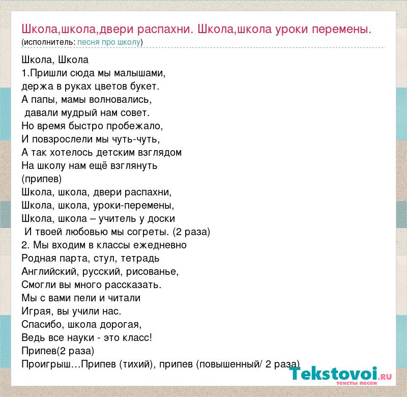 Главная→Исполнители→Песня про школу→Школа,школа,двери распахни. Школа,школа уроки перемены. Школа,школа учит