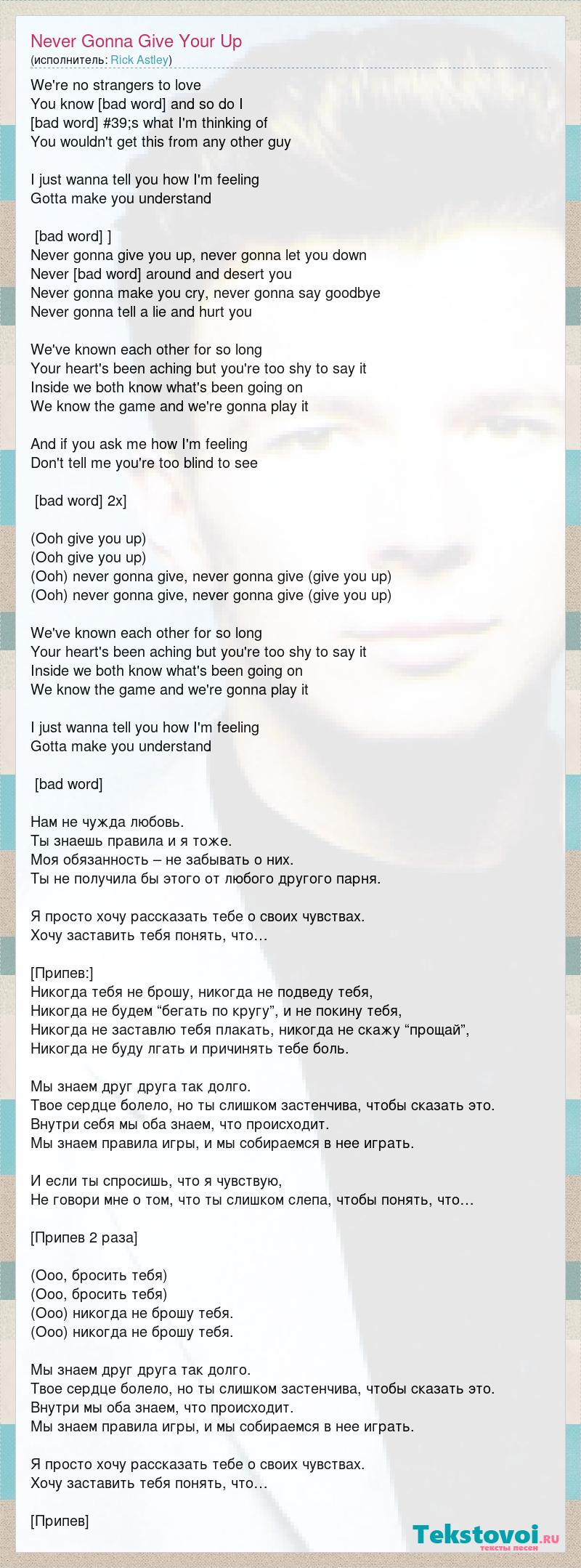 We're no strangers to love You know [bad word] and so do I [bad word] #39;s what I'm thinking of You wouldn't get this from any other guy I just wanna tell you how I'm feeling Gotta make you understand [bad word] ] Never gonna give you up, never gonna let you down Never [bad word] around and desert you Never gonna make you cry, never gonna say goodbye Never gonna tell a lie and hurt you We've known each other for so long Your heart's been aching but you're too shy to say it Inside we both know what's been going on We know the game and we're gonna play it And if you ask me how I'm feeling Don't tell me you're too blind to see [bad word] 2x] (Ooh give you up) (Ooh give you up) (Ooh) never gonna give, never gonna give (give you up) (Ooh) never gonna give, never gonna give (give you up) We've known each other for so long Your heart's been aching but you're too shy to say it Inside we both know what's been going on We know the game and we're gonna play it I just wanna tell you how I'm feeling Gotta make you understand [bad word] Нам не чужда любовь. Ты знаешь правила и я тоже. Моя обязанность – не забывать о них. Ты не получила бы этого от любого другого парня. Я просто хочу рассказать тебе о своих чувствах. Хочу заставить тебя понять, что… [Припев:] Никогда тебя не брошу, никогда не подведу тебя, Никогда не будем “бегать по кругу”, и не покину тебя, Никогда не заставлю тебя плакать, никогда не скажу “прощай”, Никогда не буду лгать и причинять тебе боль. Мы знаем друг друга так долго. Твое сердце болело, но ты слишком застенчива, чтобы сказать это. Внутри себя мы оба знаем, что происходит. Мы знаем правила игры, и мы собираемся в нее играть. И если ты спросишь, что я чувствую, Не говори мне о том, что ты слишком слепа, чтобы понять, что… [Припев 2 раза] (Ооо, бросить тебя) (Ооо, бросить тебя) (Ооо) никогда не брошу тебя. (Ооо) никогда не брошу тебя. Мы знаем друг друга так долго. Твое сердце болело, но ты слишком застенчива, чтобы сказать это. Внутри мы оба знаем, что происходит. Мы знаем правила игры, и мы собираемся в нее играть. Я просто хочу рассказать тебе о своих чувствах. Хочу заставить тебя понять, что… [Припев]