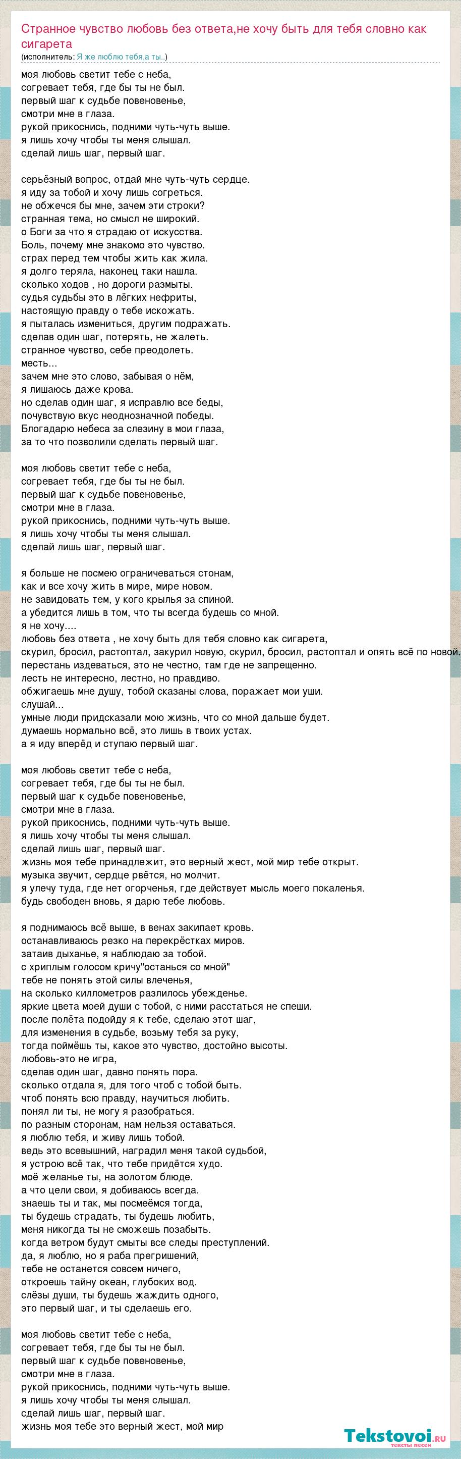 Главная→Исполнители→Я же люблю тебя,а ты..→Странное чувство любовь без ответа,не хочу быть для тебя словно как сигарета