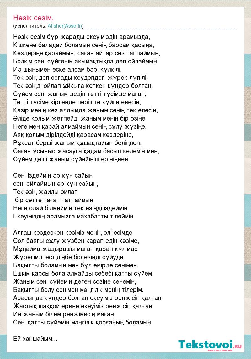 Нәзік сезім бүр жарады екеуіміздің арамызда, Кішкене баладай боламын сенің барсам қасыңа, Көздеріңе қараймын, саған айтар сөз таппаймын, Бәлкім сені сүйгенім ақымақтықпа деп ойлаймын. Иә шынымен еске алсам бәрі күлкілі, Тек өзің деп соғады кеудепдегі жүрек лүпілі, Тек өзіңді ойлап ұйқыға кеткен күндер болған, Сүйем сені жаным дедің тәтті түсімде маған, Тәтті түсіме кіргенде періште күйге енесің, Қазір менің көз алдымда жаным сенің тек елесің, Әліде қолым жетпейді жаным менің бір өзіңе Неге мен қарай алмаймын сенің сұлу жүзіңе. Аяқ қолым дірілдейді қарасам көздеріңе, Рұқсат берші жаным құшақтайын беліңнен, Саған ұсыныс жасауға қадам басып келемін мен, Сүйем деші жаным сүйейінші ерініңнен Сені іздеймін әр күн сайын сені ойлаймын әр күн сайын, Тек өзің жайлы ойлап бір сәтте тағат татпаймын Неге олай білмеймін тек өзіңді іздеймін Екеуіміздің арамызға махабатты тілеймін Алғаш кездескен кезіміз менің әлі есімде Сол баяғы сұлу жүзбен қарап едің көзіме, Мұңайма жадырашы маған қарап күлімде Жүрегімді естідіңбе бір өзіңді сүйуде. Бақытты боламын мен бұл өмірде сенімен, Ешкім қарсы бола алмайды себебі қатты сүйем Жаным сені сүйемін деген сөзіңе сенемін, Бақытты болу сенімен мәңгілік менің тілерім. Арасында күндер болған екеуіміз ренжісіп қалған Жастық шаққой әрине екеуіміз ренжісіп қалған Иә жаным білем ренжімисің маған, Сені қатты сүйемін мәңгілік қорғаның боламын Ей ханшайым...