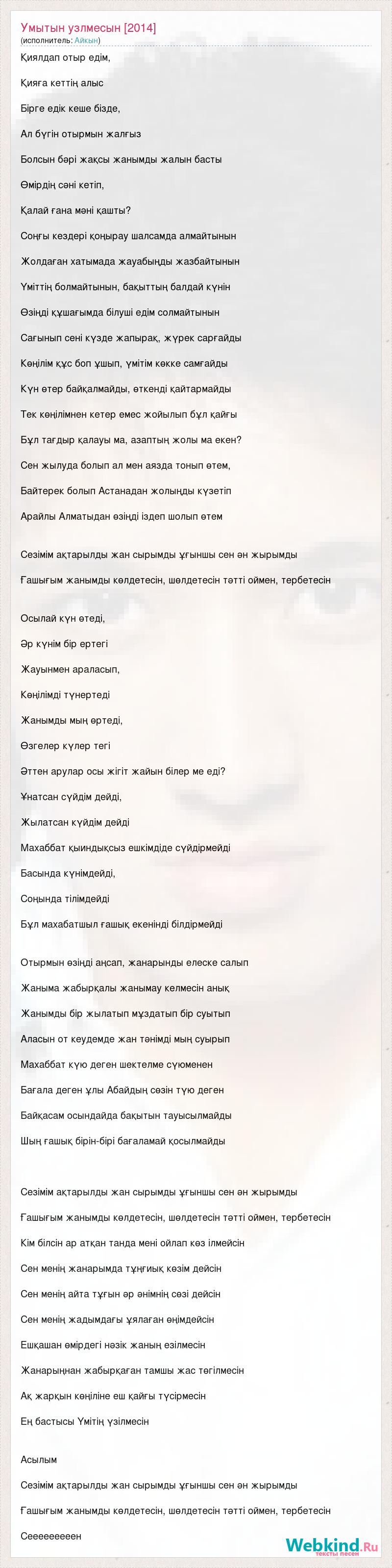 Қиялдап отыр едім, Қияға кеттің алыс Бірге едік кеше бізде, Ал бүгін отырмын жалғыз Болсын бәрі жақсы жанымды жалын басты Өмірдің сәні кетіп, Қалай ғана мәні қашты? Соңғы кездері қоңырау шалсамда алмайтынын Жолдаған хатымада жауабыңды жазбайтынын Үміттің болмайтынын, бақыттың балдай күнін Өзіңді құшағымда білуші едім солмайтынын Сағынып сені күзде жапырақ, жүрек сарғайды Көңілім құс боп ұшып, үмітім көкке самғайды Күн өтер байқалмайды, өткенді қайтармайды Тек көңілімнен кетер емес жойылып бұл қайғы Бұл тағдыр қалауы ма, азаптың жолы ма екен? Сен жылуда болып ал мен аязда тонып өтем, Байтерек болып Астанадан жолыңды күзетіп Арайлы Алматыдан өзіңді іздеп шолып өтем Сезімім ақтарылды жан сырымды ұғыншы сен ән жырымды Ғашығым жанымды көлдетесін, шөлдетесін тәтті оймен, тербетесін Осылай күн өтеді, Әр күнім бір ертегі Жауынмен араласып, Көңілімді түнертеді Жанымды мың өртеді, Өзгелер күлер тегі Әттен арулар осы жігіт жайын білер ме еді? Ұнатсан сүйдім дейді, Жылатсан күйдім дейді Махаббат қыиндықсыз ешкімдіде сүйдірмейді Басында күнімдейді, Соңында тілімдейді Бұл махабатшыл ғашық екенінді білдірмейді Отырмын өзіңді аңсап, жанарынды елеске салып Жаныма жабырқалы жанымау келмесін анық Жанымды бір жылатып мұздатып бір суытып Аласын от кеудемде жан тәнімді мың суырып Махаббат күю деген шектелме сүюменен Бағала деген ұлы Абайдың сөзін түю деген Байқасам осындайда бақытын тауысылмайды Шың ғашық бірін-бірі бағаламай қосылмайды Сезімім ақтарылды жан сырымды ұғыншы сен ән жырымды Ғашығым жанымды көлдетесін, шөлдетесін тәтті оймен, тербетесін Кім білсін ар атқан танда мені ойлап көз ілмейсін Сен менің жанарымда тұңғиық көзім дейсін Сен менің айта тұғын әр әнімнің сөзі дейсін Сен менің жадымдағы ұялаған өңімдейсін Ешқашан өмірдегі нәзік жаның езілмесін Жанарыңнан жабырқаған тамшы жас төгілмесін Ақ жарқын көңіліне еш қайғы түсірмесін Ең бастысы Үмітің үзілмесін Асылым Сезімім ақтарылды жан сырымды ұғыншы сен ән жырымды Ғашығым жанымды көлдетесін, шөлдетесін тәтті оймен, тербетесін Сееееееееен