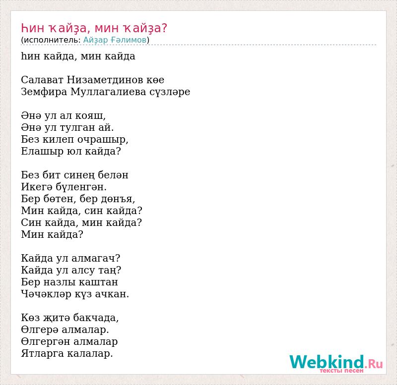 hин кайда, мин кайда Салават Низаметдинов көе Земфира Муллагалиева сүзләре Әнә ул ал кояш, Әнә ул тулган ай. Без килеп очрашыр, Елашыр юл кайда? Без бит синең белән Икегә бүленгән. Бер бөтен, бер дөнъя, Мин кайда, син кайда? Син кайда, мин кайда? Мин кайда? Кайда ул алмагач? Кайда ул алсу таң? Бер назлы каштан Чәчәкләр күз ачкан. Көз җитә бакчада, Өлгерә алмалар. Өлгергән алмалар Ятларга калалар.