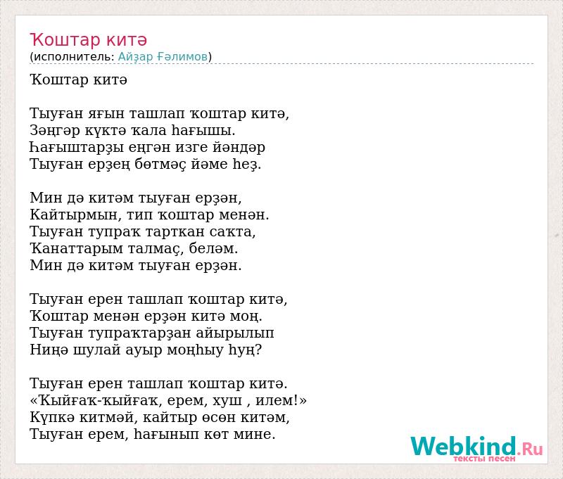 Ҡоштар китә Тыуған яғын ташлап ҡоштар китә, Зәңгәр күктә ҡала hағышы. Һағыштарҙы еңгән изге йәндәр Тыуған ерҙең бөтмәҫ йәме hеҙ. Мин дә китәм тыуған ерҙән, Кайтырмын, тип ҡоштар менән. Тыуған тупраҡ тарткан саҡта, Ҡанаттарым талмаҫ, беләм. Мин дә китәм тыуған ерҙән. Тыуған ерен ташлап ҡоштар китә, Ҡоштар менән ерҙән китә моң. Тыуған тупраҡтарҙан айырылып Ниңә шулай ауыр моңhыу hуң? Тыуған ерен ташлап ҡоштар китә. «Ҡыйғаҡ-ҡыйғаҡ, ерем, хуш , илем!» Күпкә китмәй, кайтыр өсөн китәм, Тыуған ерем, hағынып көт мине.