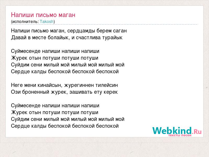 Напиши письмо маган, сердцамды берем саган Давай в месте болайык, и счастлива турайык Суймесенде напиши напиши напиши Журек отын потуши потуши потуши Суйдим сени милый мой милый мой милый мой Сердце калды беспокой беспокой беспокой Неге мени кинайсын, журегиннен тилейсин Ози броненный журек, зашивать ету керек Суймесенде напиши напиши напиши Журек отын потуши потуши потуши Суйдим сени милый мой милый мой милый мой Сердце калды беспокой беспокой беспокой