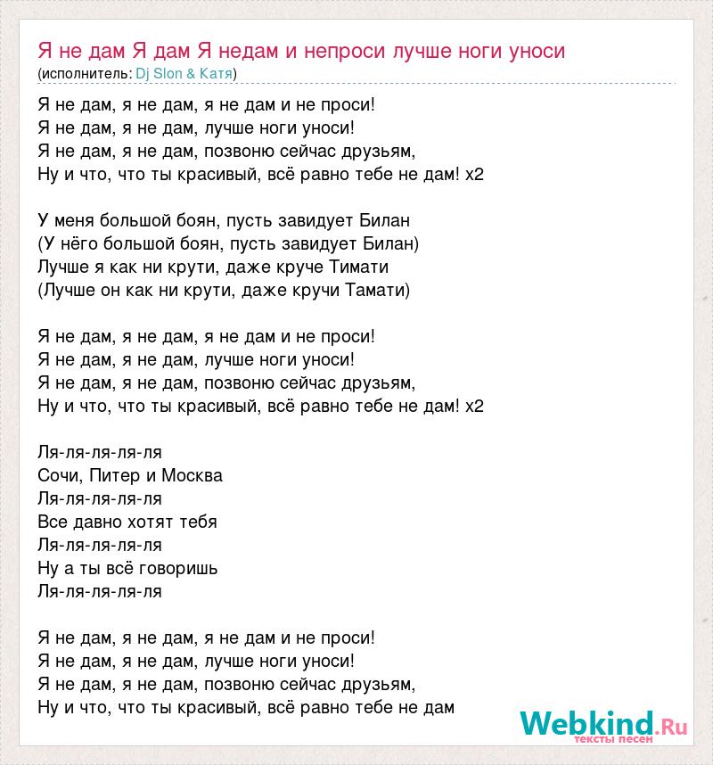 Я не дам, я не дам, я не дам и не проси! Я не дам, я не дам, лучше ноги уноси! Я не дам, я не дам, позвоню сейчас друзьям, Ну и что, что ты красивый, всё равно тебе не дам! х2 У меня большой боян, пусть завидует Билан (У нёго большой боян, пусть завидует Билан) Лучше я как ни крути, даже круче Тимати (Лучше он как ни крути, даже кручи Тамати) Я не дам, я не дам, я не дам и не проси! Я не дам, я не дам, лучше ноги уноси! Я не дам, я не дам, позвоню сейчас друзьям, Ну и что, что ты красивый, всё равно тебе не дам! х2 Ля-ля-ля-ля-ля Сочи, Питер и Москва Ля-ля-ля-ля-ля Все давно хотят тебя Ля-ля-ля-ля-ля Ну а ты всё говоришь Ля-ля-ля-ля-ля Я не дам, я не дам, я не дам и не проси! Я не дам, я не дам, лучше ноги уноси! Я не дам, я не дам, позвоню сейчас друзьям, Ну и что, что ты красивый, всё равно тебе не дам