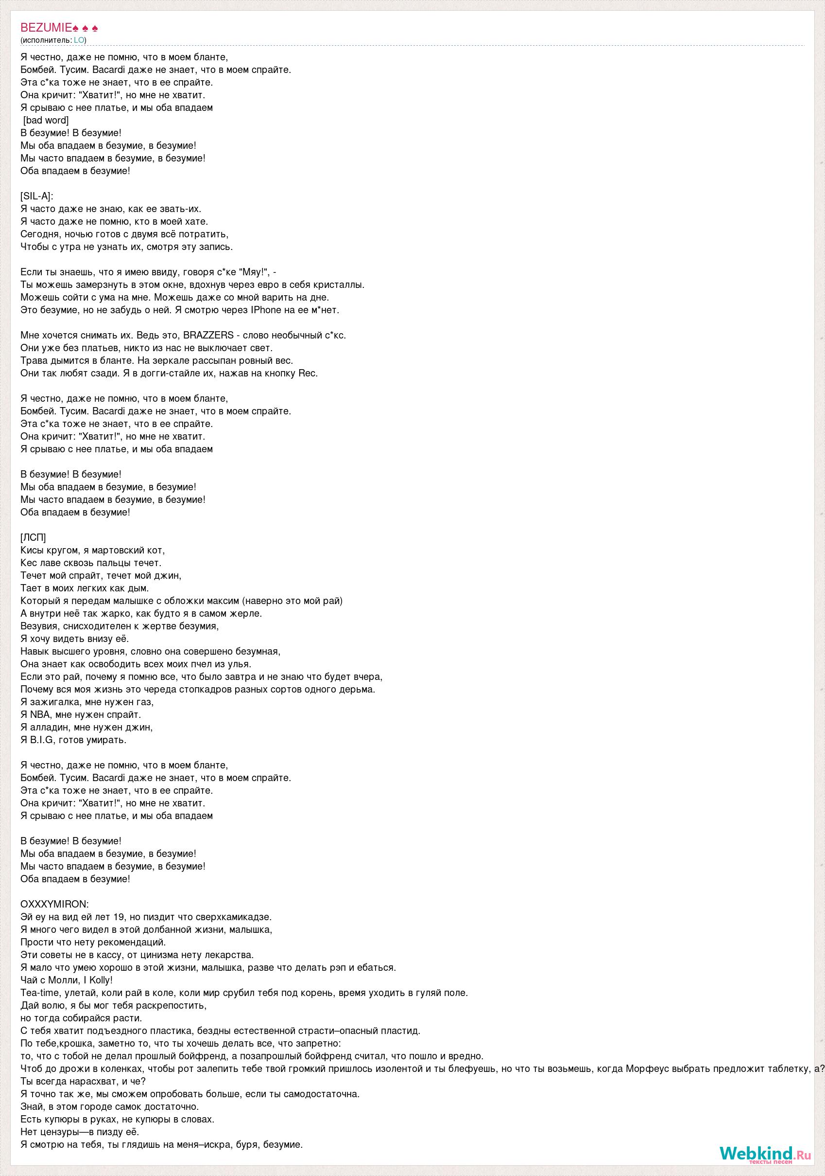 Я честно, даже не помню, что в моем бланте, Бомбей. Тусим. Bacardi даже не знает, что в моем спрайте. Эта с*ка тоже не знает, что в ее спрайте. Она кричит: "Хватит!", но мне не хватит. Я срываю с нее платье, и мы оба впадаем [bad word] В безумие! В безумие! Мы оба впадаем в безумие, в безумие! Мы часто впадаем в безумие, в безумие! Оба впадаем в безумие! [SIL-A]: Я часто даже не знаю, как ее звать-их. Я часто даже не помню, кто в моей хате. Сегодня, ночью готов с двумя всё потратить, Чтобы с утра не узнать их, смотря эту запись. Если ты знаешь, что я имею ввиду, говоря с*ке "Мяу!", - Ты можешь замерзнуть в этом окне, вдохнув через евро в себя кристаллы. Можешь сойти с ума на мне. Можешь даже со мной варить на дне. Это безумие, но не забудь о ней. Я смотрю через IPhone на ее м*нет. Мне хочется снимать их. Ведь это, BRAZZERS - слово необычный с*кс. Они уже без платьев, никто из нас не выключает свет. Трава дымится в бланте. На зеркале рассыпан ровный вес. Они так любят сзади. Я в догги-стайле их, нажав на кнопку Rec. Я честно, даже не помню, что в моем бланте, Бомбей. Тусим. Bacardi даже не знает, что в моем спрайте. Эта с*ка тоже не знает, что в ее спрайте. Она кричит: "Хватит!", но мне не хватит. Я срываю с нее платье, и мы оба впадаем В безумие! В безумие! Мы оба впадаем в безумие, в безумие! Мы часто впадаем в безумие, в безумие! Оба впадаем в безумие! [ЛСП] Кисы кругом, я мартовский кот, Кес лаве сквозь пальцы течет. Течет мой спрайт, течет мой джин, Тает в моих легких как дым. Который я передам малышке с обложки максим (наверно это мой рай) А внутри неё так жарко, как будто я в самом жерле. Везувия, снисходителен к жертве безумия, Я хочу видеть внизу её. Навык высшего уровня, словно она совершено безумная, Она знает как освободить всех моих пчел из улья. Если это рай, почему я помню все, что было завтра и не знаю что будет вчера, Почему вся моя жизнь это череда стопкадров разных сортов одного дерьма. Я зажигалка, мне нужен газ, Я NBA, мне нужен спрайт. Я алладин, мне нужен джин, Я B.I.G, готов умирать. Я честно, даже не помню, что в моем бланте, Бомбей. Тусим. Bacardi даже не знает, что в моем спрайте. Эта с*ка тоже не знает, что в ее спрайте. Она кричит: "Хватит!", но мне не хватит. Я срываю с нее платье, и мы оба впадаем В безумие! В безумие! Мы оба впадаем в безумие, в безумие! Мы часто впадаем в безумие, в безумие! Оба впадаем в безумие! OXXXYMIRON: Эй еу на вид ей лет 19, но пиздит что сверхкамикадзе. Я много чего видел в этой долбанной жизни, малышка, Прости что нету рекомендаций. Эти советы не в кассу, от цинизма нету лекарства. Я мало что умею хорошо в этой жизни, малышка, разве что делать рэп и ебаться. Чай с Молли, I Kolly! Tea-time, улетай, коли рай в коле, коли мир срубил тебя под корень, время уходить в гуляй поле. Дай волю, я бы мог тебя раскрепостить, но тогда собирайся расти. С тебя хватит подъездного пластика, бездны естественной страсти–опасный пластид. По тебе,крошка, заметно то, что ты хочешь делать все, что запретно: то, что с тобой не делал прошлый бойфренд, а позапрошлый бойфренд считал, что пошло и вредно. Чтоб до дрожи в коленках, чтобы рот залепить тебе твой громкий пришлось изолентой и ты блефуешь, но что ты возьмешь, когда Морфеус выбрать предложит таблетку, а? Ты всегда нарасхват, и че? Я точно так же, мы сможем опробовать больше, если ты самодостаточна. Знай, в этом городе самок достаточно. Есть купюры в руках, не купюры в словах. Нет цензуры—в пизду