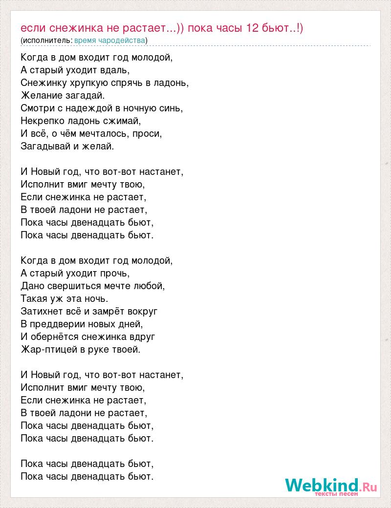Когда в дом входит год молодой, А старый уходит вдаль, Снежинку хрупкую спрячь в ладонь, Желание загадай. Смотри с надеждой в ночную синь, Некрепко ладонь сжимай, И всё, о чём мечталось, проси, Загадывай и желай. И Новый год, что вот-вот настанет, Исполнит вмиг мечту твою, Если снежинка не растает, В твоей ладони не растает, Пока часы двенадцать бьют, Пока часы двенадцать бьют. Когда в дом входит год молодой, А старый уходит прочь, Дано свершиться мечте любой, Такая уж эта ночь. Затихнет всё и замрёт вокруг В преддверии новых дней, И обернётся снежинка вдруг Жар-птицей в руке твоей. И Новый год, что вот-вот настанет, Исполнит вмиг мечту твою, Если снежинка не растает, В твоей ладони не растает, Пока часы двенадцать бьют, Пока часы двенадцать бьют. Пока часы двенадцать бьют, Пока часы двенадцать бьют.