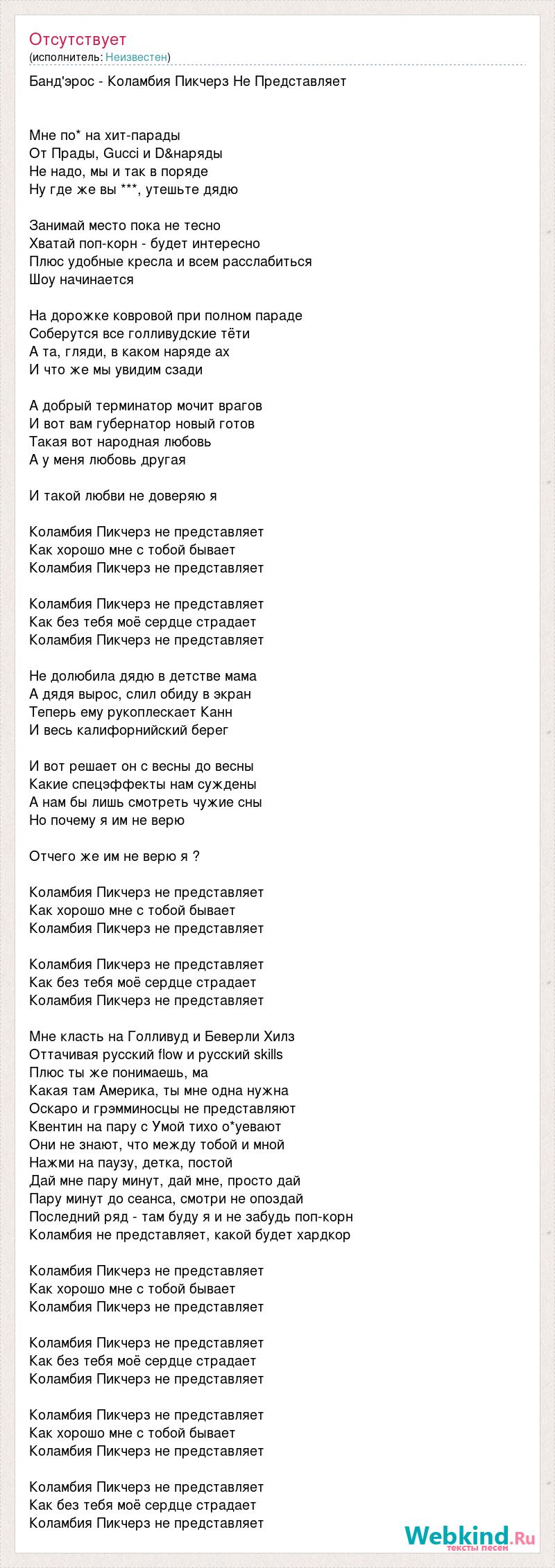 Банд'эрос - Коламбия Пикчерз Не Представляет Мне по* на хит-парады От Прады, Gucci и D&наряды Не надо, мы и так в поряде Ну где же вы ***, утешьте дядю Занимай место пока не тесно Хватай поп-корн - будет интересно Плюс удобные кресла и всем расслабиться Шоу начинается На дорожке ковровой при полном параде Соберутся все голливудские тёти А та, гляди, в каком наряде ах И что же мы увидим сзади А добрый терминатор мочит врагов И вот вам губернатор новый готов Такая вот народная любовь А у меня любовь другая И такой любви не доверяю я Коламбия Пикчерз не представляет Как хорошо мне с тобой бывает Коламбия Пикчерз не представляет Коламбия Пикчерз не представляет Как без тебя моё сердце страдает Коламбия Пикчерз не представляет Не долюбила дядю в детстве мама А дядя вырос, слил обиду в экран Теперь ему рукоплескает Канн И весь калифорнийский берег И вот решает он с весны до весны Какие спецэффекты нам суждены А нам бы лишь смотреть чужие сны Но почему я им не верю Отчего же им не верю я ? Коламбия Пикчерз не представляет Как хорошо мне с тобой бывает Коламбия Пикчерз не представляет Коламбия Пикчерз не представляет Как без тебя моё сердце страдает Коламбия Пикчерз не представляет Мне класть на Голливуд и Беверли Хилз Оттачивая русский flow и русский skills Плюс ты же понимаешь, ма Какая там Америка, ты мне одна нужна Оскаро и грэмминосцы не представляют Квентин на пару с Умой тихо о*уевают Они не знают, что между тобой и мной Нажми на паузу, детка, постой Дай мне пару минут, дай мне, просто дай Пару минут до сеанса, смотри не опоздай Последний ряд - там буду я и не забудь поп-корн Коламбия не представляет, какой будет хардкор Коламбия Пикчерз не представляет Как хорошо мне с тобой бывает Коламбия Пикчерз не представляет Коламбия Пикчерз не представляет Как без тебя моё сердце страдает Коламбия Пикчерз не представляет Коламбия Пикчерз не представляет Как хорошо мне с тобой бывает Коламбия Пикчерз не представляет Коламбия Пикчерз не представляет Как без тебя моё сердце страдает Коламбия Пикчерз не представляет