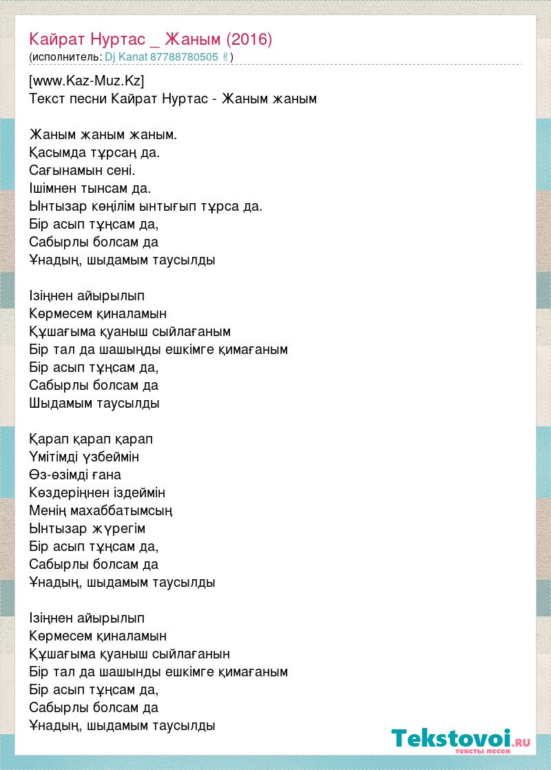 [www.Kaz-Muz.Kz] Текст песни Кайрат Нуртас - Жаным жаным Жаным жаным жаным. Қасымда тұрсаң да. Сағынамын сені. Ішімнен тынсам да. Ынтызар көңілім ынтығып тұрса да. Бір асып тұңсам да, Сабырлы болсам да Ұнадың, шыдамым таусылды Ізіңнен айырылып Көрмесем қиналамын Құшағыма қуаныш сыйлағаным Бір тал да шашыңды ешкімге қимағаным Бір асып тұңсам да, Сабырлы болсам да Шыдамым таусылды Қарап қарап қарап Үмітімді үзбеймін Өз-өзімді ғана Көздеріңнен іздеймін Менің махаббатымсың Ынтызар жүрегім Бір асып тұңсам да, Сабырлы болсам да Ұнадың, шыдамым таусылды Ізіңнен айырылып Көрмесем қиналамын Құшағыма қуаныш сыйлағанын Бір тал да шашынды ешкімге қимағаным Бір асып тұңсам да, Сабырлы болсам да Ұнадың, шыдамым таусылды